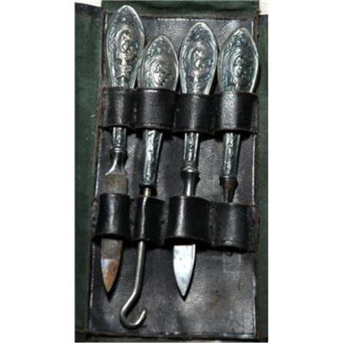4 piece grooming set or manicure set of sterling silver. One of the items is a button hook. The rest are for manicuring. The weight of the pieces without the case is 46 grams. The handles are of ornate repousse work. The handles meausre 2 7/8" long. <p> They are un-polished and each handle is simply marked " Sterling". The handles are sterling whereas the tools are most likely of steel. They come in a green satin lined leather envelop case. <p> The condition show the age with the very dark patina. The file shows a bit of rust. The rest of the tools are fine.