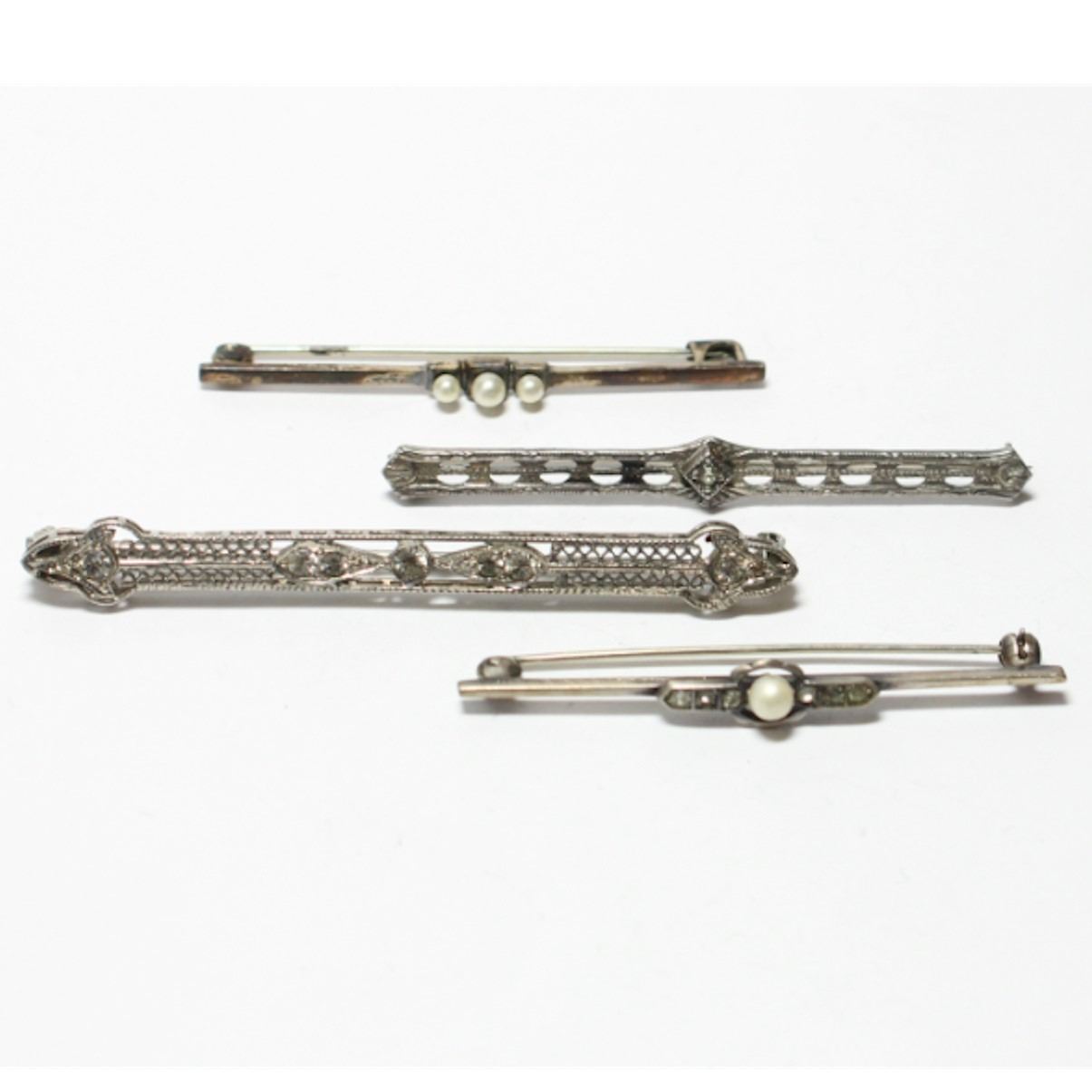 Antique Sterling Silver Bar Pin Collection with Stone/Pearl Accents. You will receive 4 Pins in this lot. They remain in good collectable condition with all accents intact. Pins measure between 2" and 2 1/2" in length. Total weight of the collection is 11.05grams. 4pcs.
