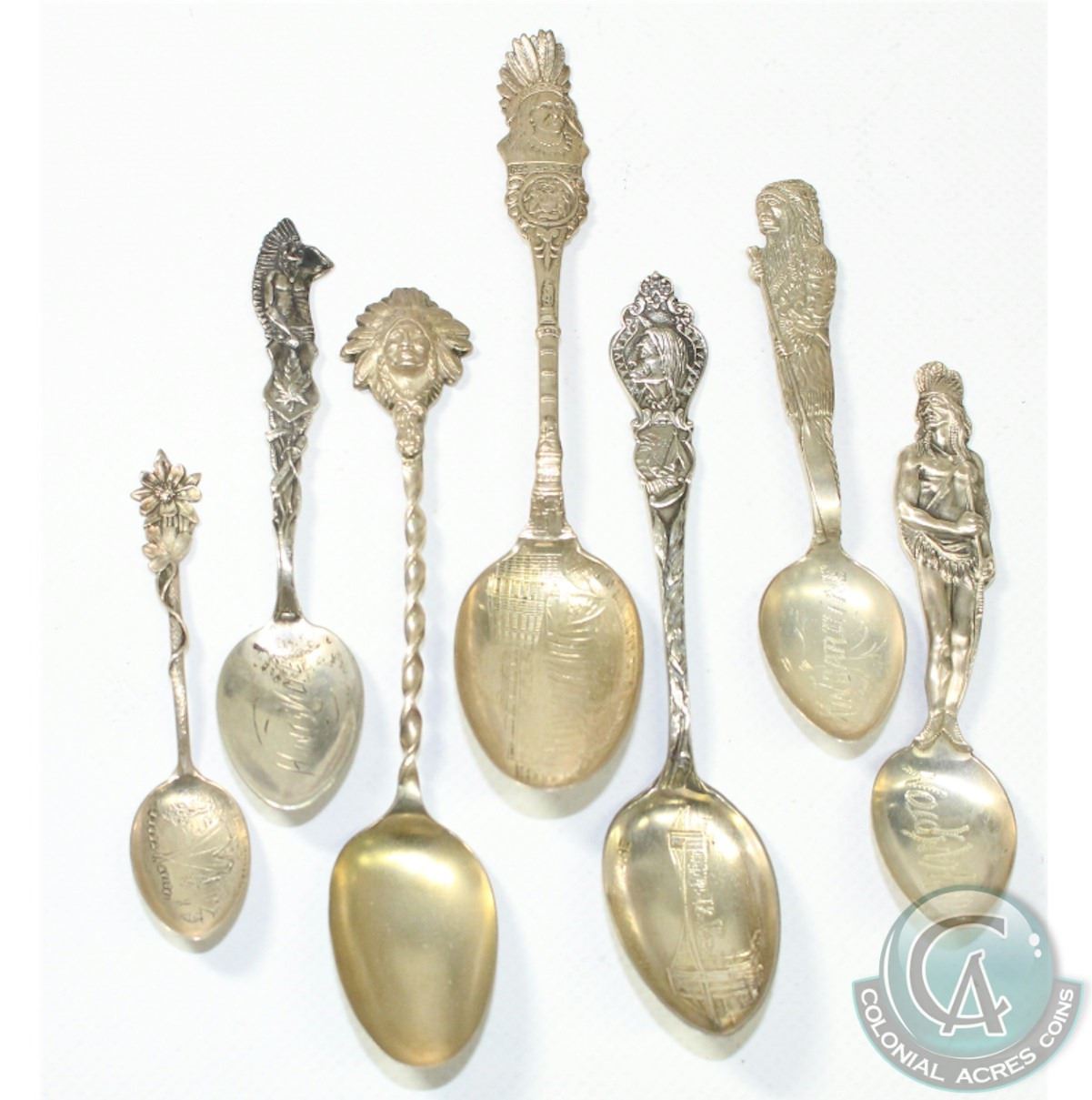 Antique Sterling Silver Native Inspired Figural Souvenir Spoon Collection. You will receive 7 Unique Spoons in this collection. 7pcs.