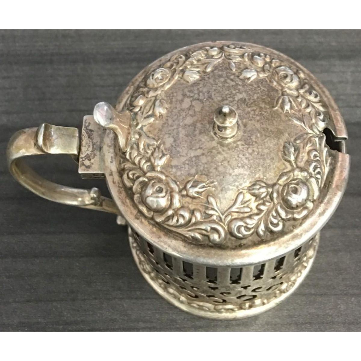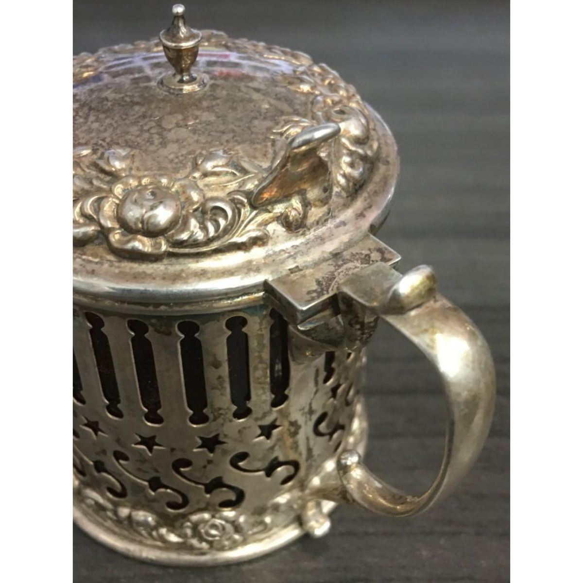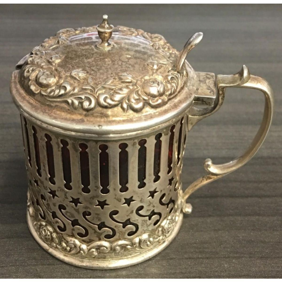 Antique Sterling Silver Repousse Cranberry Glass Condiment Mustard Pot Jam Jar. The Floral Design Is Complimented By A Perforated Star & Roller Design That Allows For The Cranberry Liner To Shows Its Glory. Marked 1 1/2 On The Side & Hallmarked With Sterling & Makers Mark. The Thumb Notch Allows For The Lid To Fold Open. Scrolled Handle Is Seamless and Adds To The Beauty Of This Collectible & Practical Table Ware. View Photos For Further Details.