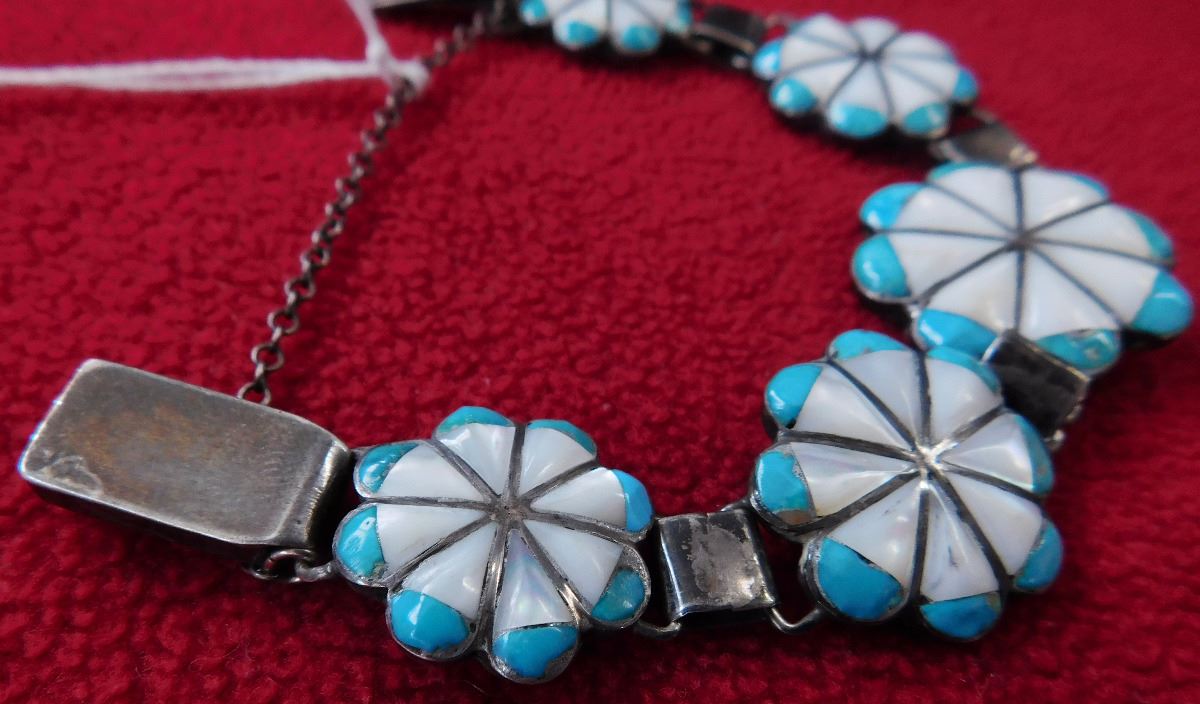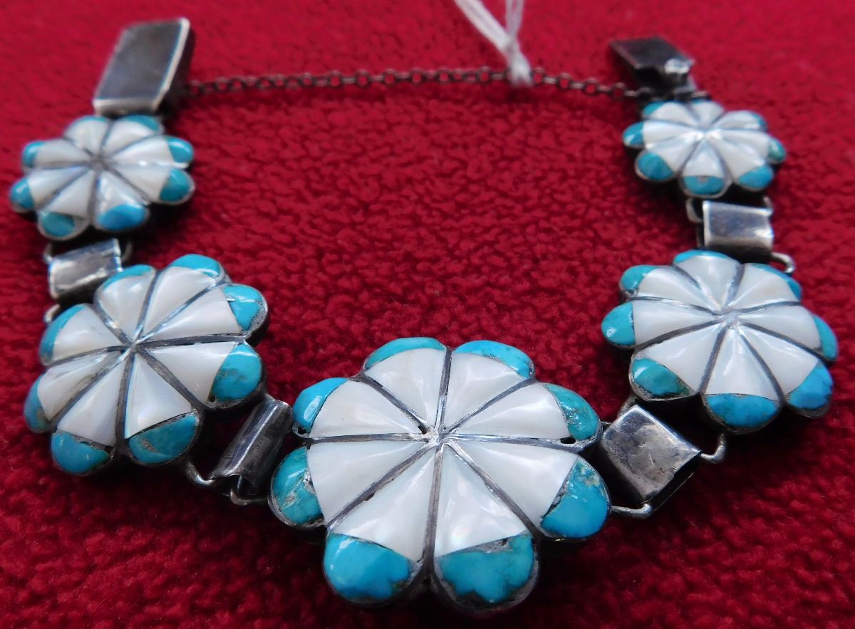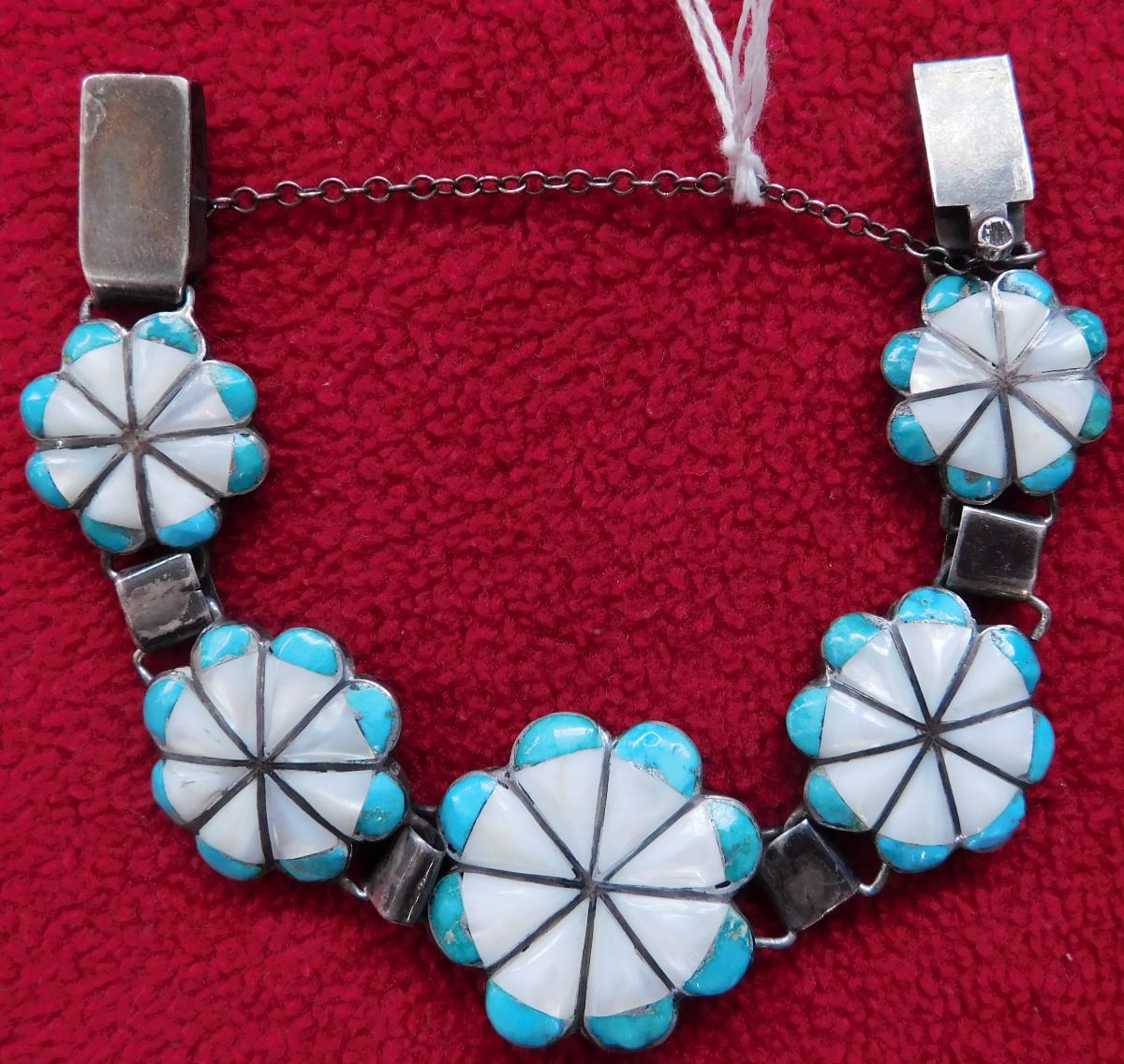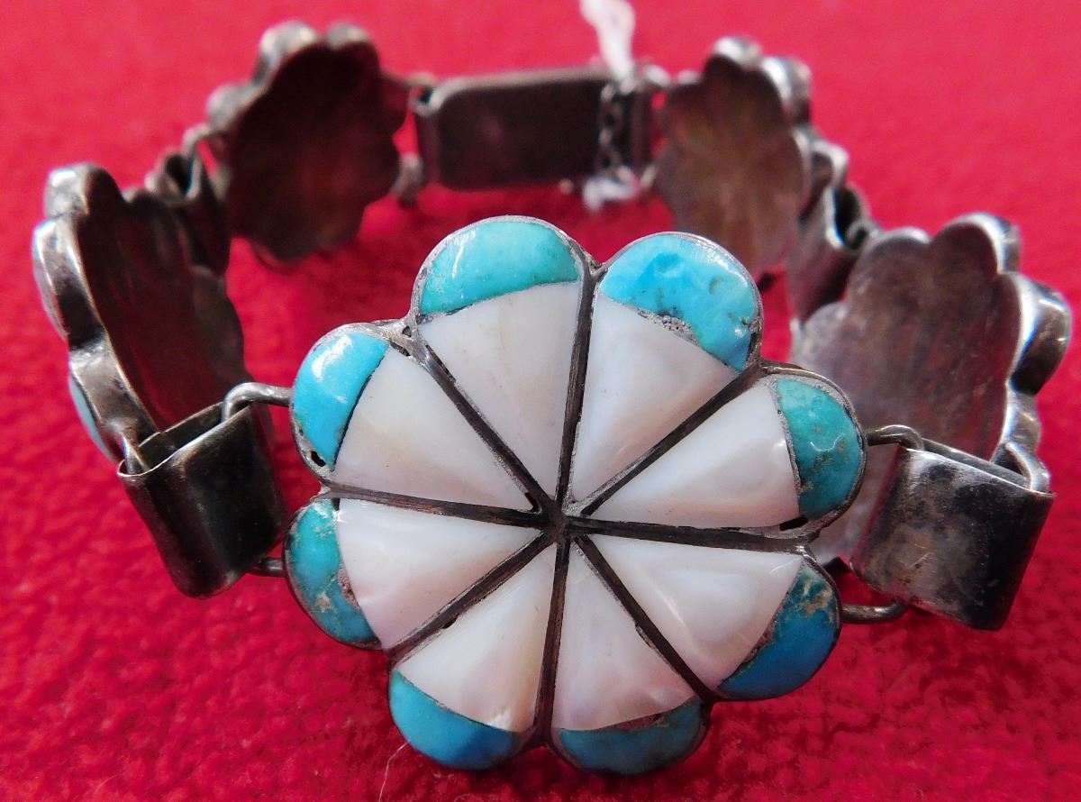 Antique Stone-to-Stone Zuni Link Cuff, circa 1930s. Made of mother of pearl, sterling silver and turquoise, the item measures 6.75" x 1" fastened (as worn), and has a 2.75" opening when the great-locking clasp is undone and safety chain stretched widest. Zuni, New Mexico. The stone-to-stone flower designs measure 0.75" x 0.75" to 1.25" x 1.25" in center. Item weighs approx. 26 grams. Condition: Minor nick and chips to stone, nice patina, see images. Shipping: $16.00 w/insurance.