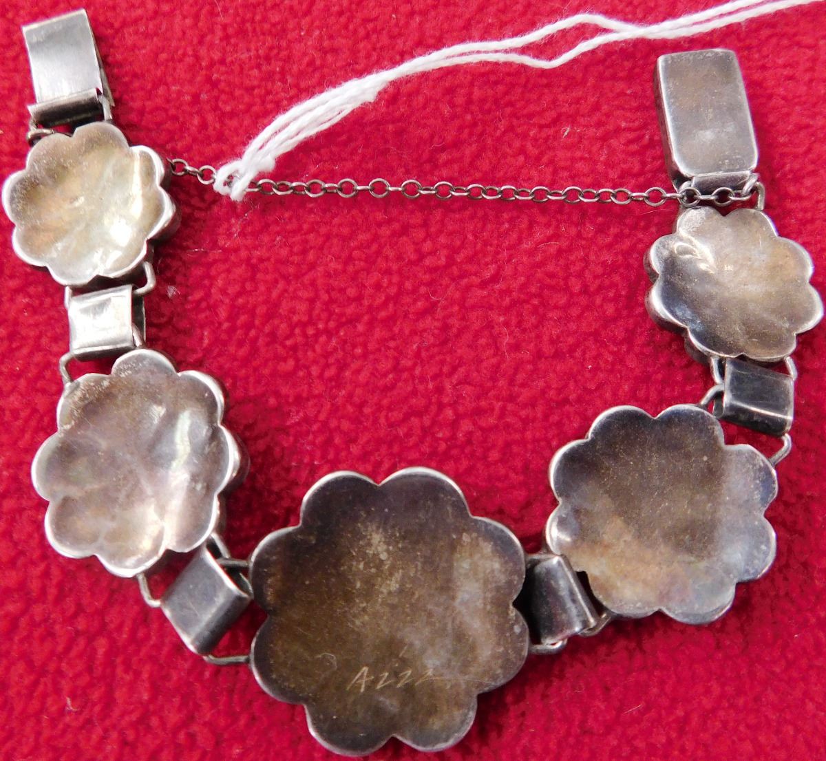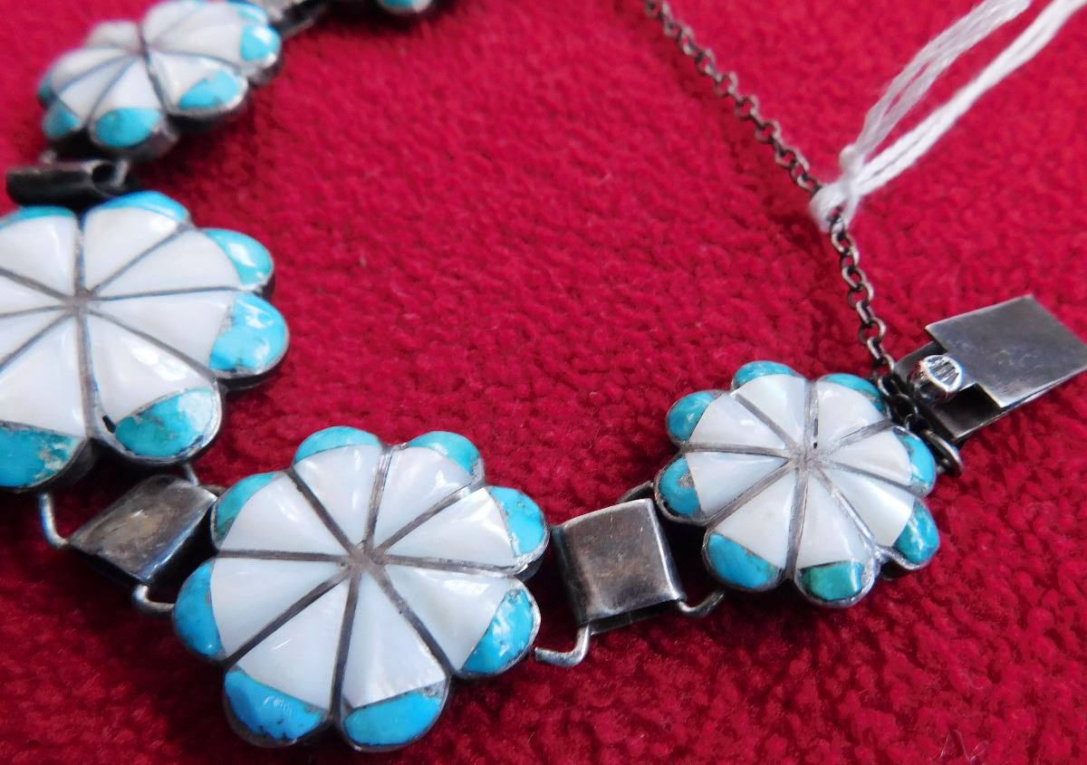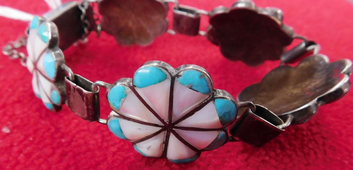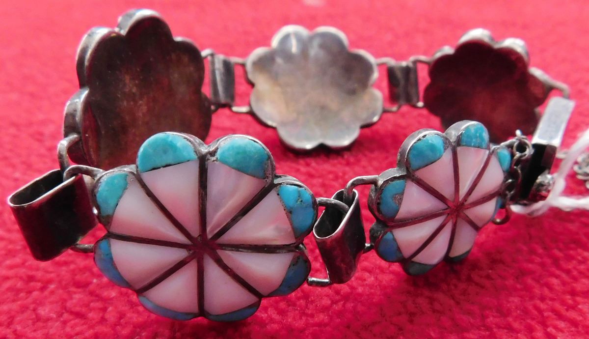 Antique Stone-to-Stone Zuni Link Cuff, circa 1930s. Made of mother of pearl, sterling silver and turquoise, the item measures 6.75" x 1" fastened (as worn), and has a 2.75" opening when the great-locking clasp is undone and safety chain stretched widest. Zuni, New Mexico. The stone-to-stone flower designs measure 0.75" x 0.75" to 1.25" x 1.25" in center. Item weighs approx. 26 grams. Condition: Minor nick and chips to stone, nice patina, see images. Shipping: $16.00 w/insurance.