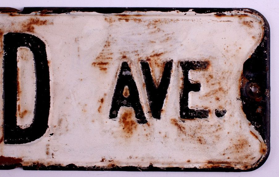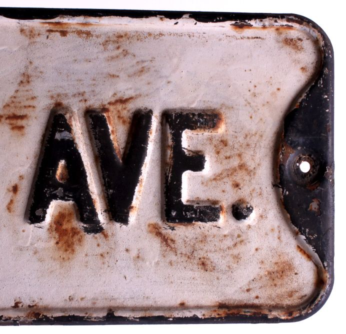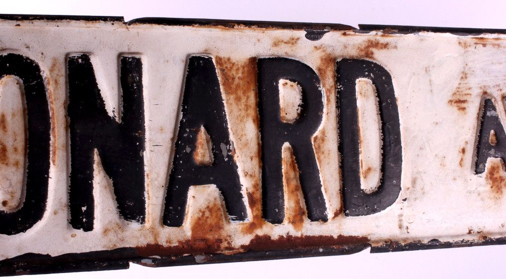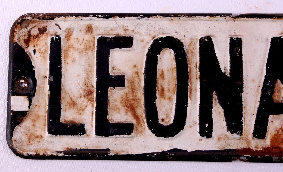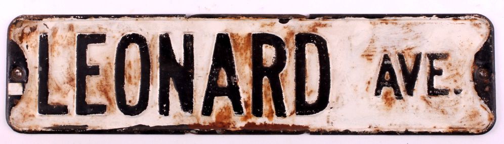 This is an original street sign that reads "Leonard Ave.". It is from the early to mid 1900's. The sign is in good condition showing some rust. The sign measures 6" x 24".