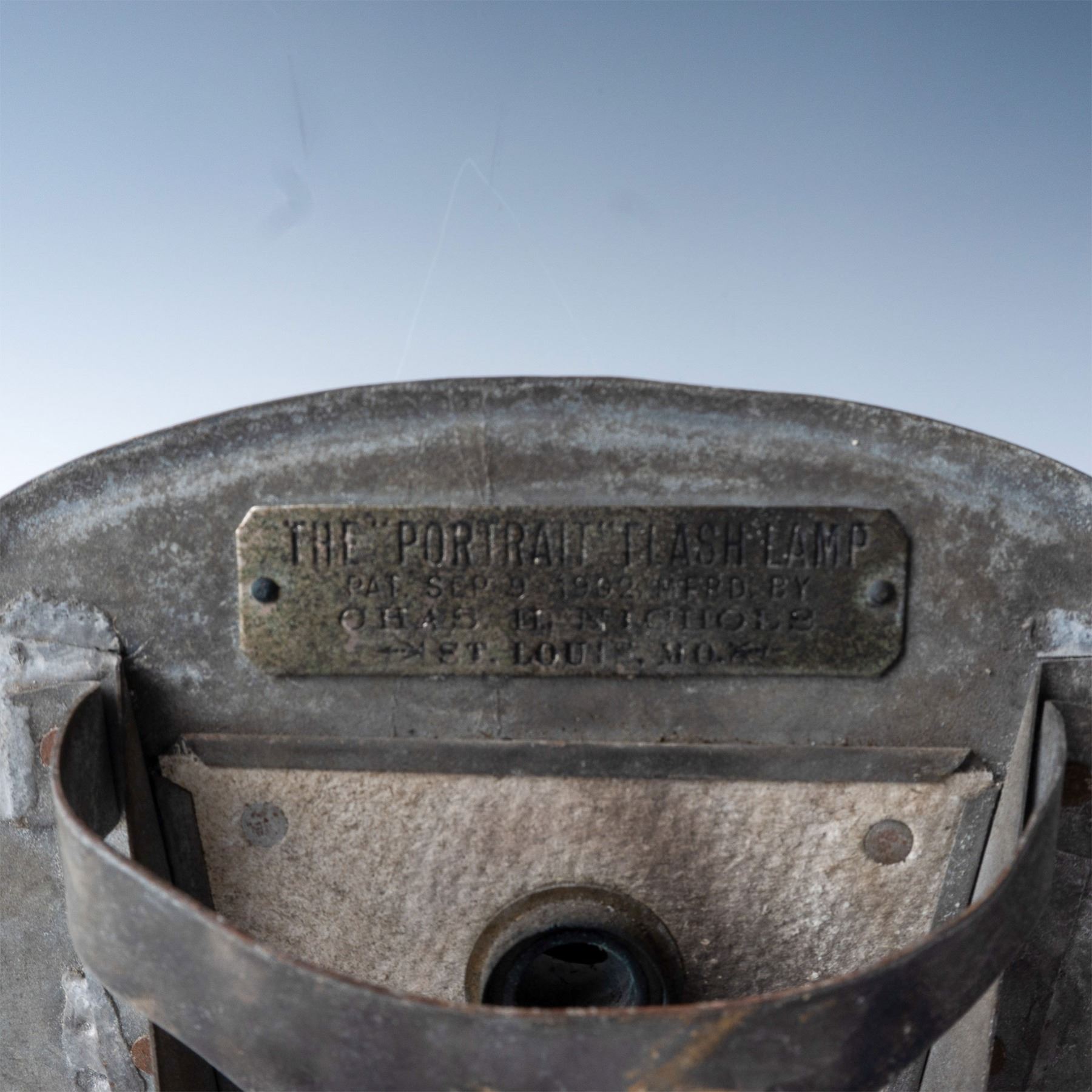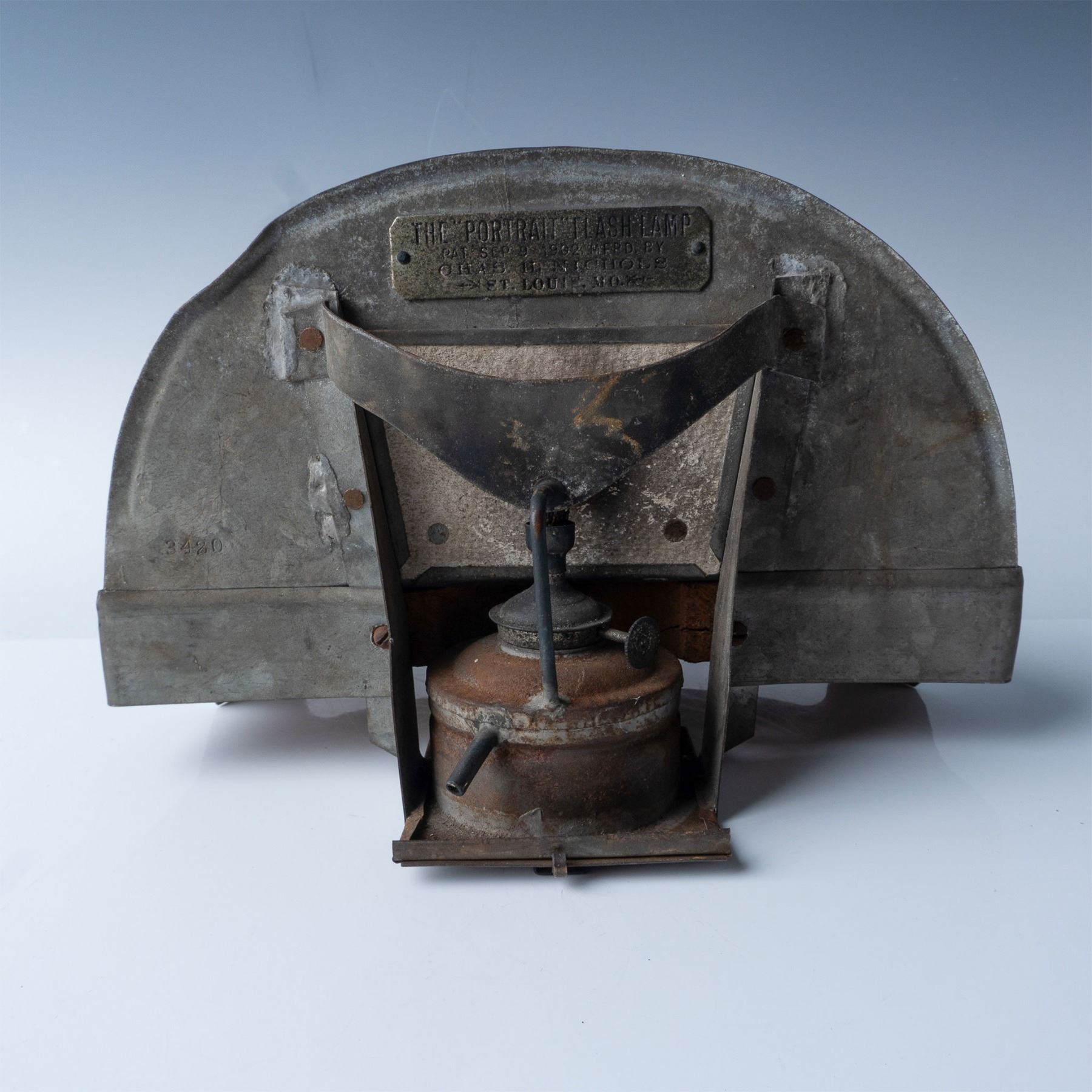 A rare and intriguing piece of photographic history, this vintage portrait flash lamp was manufactured by Chas. H. Nichols of St. Louis, Missouri. The lamp is prominently marked with its original manufacturer's plaque, which reads: "The Portrait Flash Lamp, Pat. Sept. 9, 1902, Chas. H. Nichols, St. Louis, MO." This was the first flash lamp to be mounted on a tripod using magnesium powder. The copyright date signifies the patent and early development of flash lamp technology for photography.