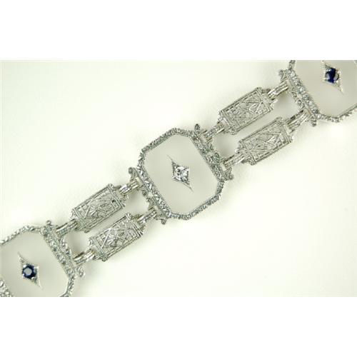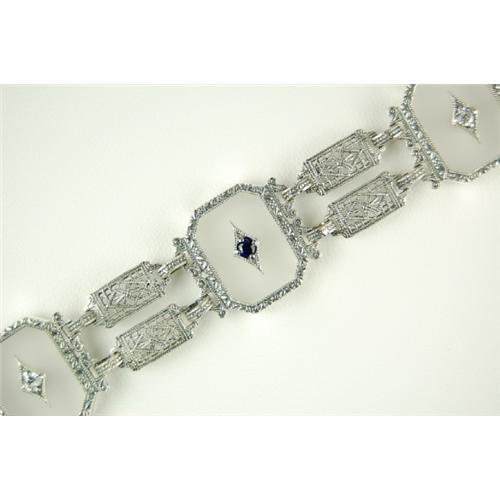 This Antique Style Bracelet is an Authentic and Accurate copy of a bracelet from the 1930s, but THIS one is in Mint condition! It is a Vintage style STERLING Silver Bracelet featuring Crystals, Sapphires and Diamonds! The Bracelet is 7 inches in length and it is 3/4 inch wide. It IS exquisite!