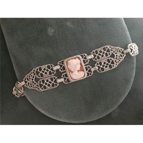 This Antique Style Bracelet is an Authentic and Accurate copy of a Bracelet from the 1930s and THIS one is in MINT condition! It is Sterling Silver and it features a handcarved CAMEO measuring 1/4" x 1/2". The filigree work either side of the Cameo is magnificent. The bracelet is 7 1/4" in length and it is just beautiful!