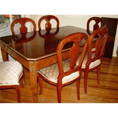 Nice quarter-sawn walnut veneer top extendable dinning table with 6 chairs adorned with inlays and bronze acanthus leaf, winged griffin and lions claw feet bronze mounts. The table measures 31 inches in height, 39 1/2 inches in width and 63 inches in length without the extension and 79 inches length with the extension, the chair measure 40 inches in height. This set would make a nice addition to any fine household. Condition: Restoration to some of the veneering. ****NOTE: This item is not old.