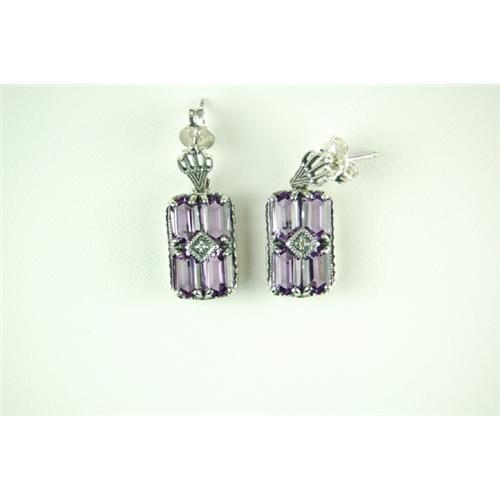 This pair of Antique Style Earrings is an Authentic and Accurate copy of a pair from the 1930s but THIS pair is in MINT condition! They are STERLING Silver and each Earrings features 4 GENUINE AMETHYSTS with a center Diamond. The Amethysts are set in an exquisite 'filigree basket'. They measure 1/2" x 1/4" and they have post style tops for pierced ears.