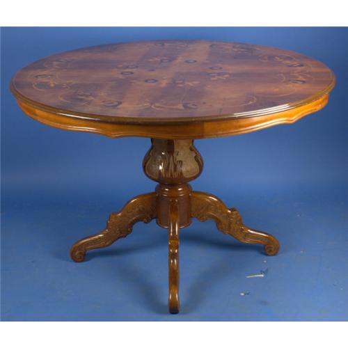 This lovely walnut dining table was crafted in England around 1960. Since then, the wood has come to acquire a delicate patina that complements the walnut quite nicely. Carvings on the pedestal base and legs accent the beautiful grain and texture, as well as elegant shaping in the legs. The flowing, shaped skirt brings out the lovely round shape of the top, which features beautiful satinwood inlay. Beneath the table, the base is secured firmly to the top (pictured below), and despite significant scratching on the top surface, condition remains excellent. This elegant walnut pedestal dining table would certainly make a fine addition to any home.