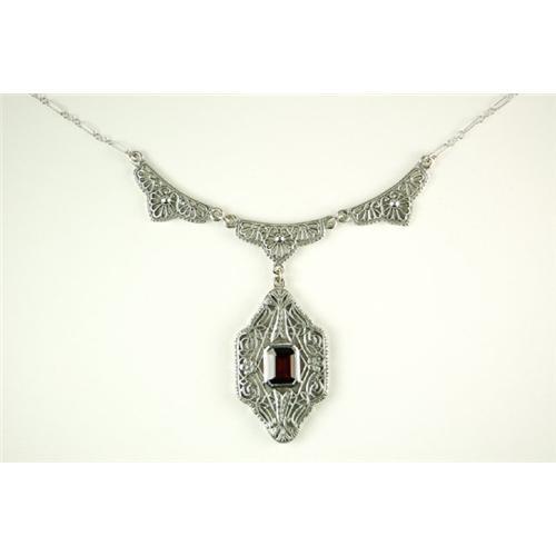 This Antique Style Pendant Necklace is an Authentic and Accurate copy of a Necklace from the 1930s and THIS one is in MINT condition! It is STERLING SILVER and it features a GARNET Pendant surrounded by Outstanding filigree work. The STERLING Necklace measures 22" in length including the Garnet pendant.