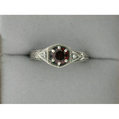It is Solid STERLING Silver and it features a Genuine round Garnet = .50 Carats, with a Diamond set each side as accent. The Garnet and Diamonds are surrounded by Sterling Silver filigree work. This ring is now a size 7 and I can easily resize it for you.