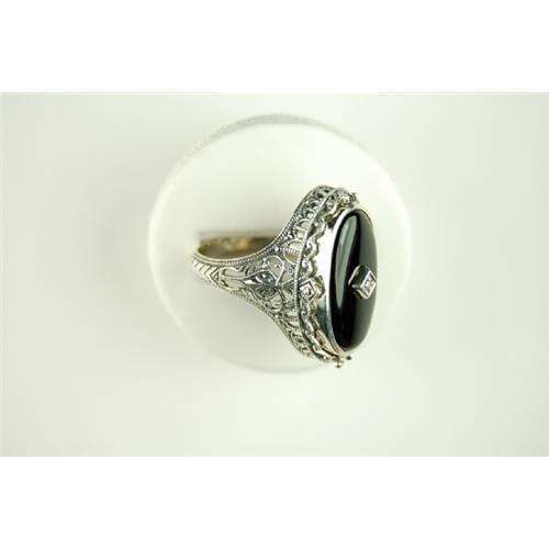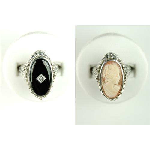 When you buy this Vintage Style ring from my collection you are DEFINITELY gettng TWO RINGS for the price of one! This ring is Solid Sterling Silver, and it features stunning filigree work made popular in the 1930's. It is called a FLIP ring, because it features an Oval Black Onyx with a center Diamond on one side - and an Oval handcarved Cameo on the other side! It is in Mint condition. This ring is a Size 6 and I can easily resize it for you. I HIGHLY recommend it to you!