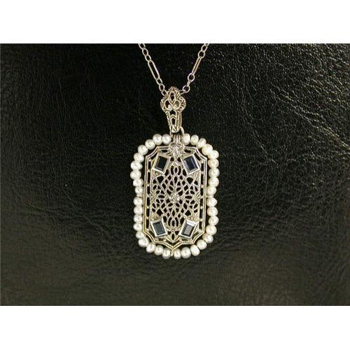 This Antique Style Necklace is an Authentic & Accurate copy of a Necklace from the 1930's and THIS one is in MINT condition. It is an Antique Style Sterling Silver necklace 18 inches in length with an exquisite pendant featuring filigree work, 4 Genuine Sapphires and a center Diamond! The pendant measures 1 inch by 3/4 inch and it is surrounded by Seed Pearls.