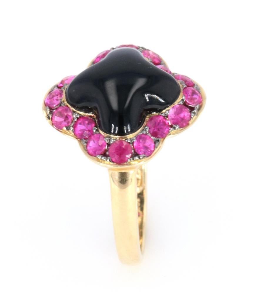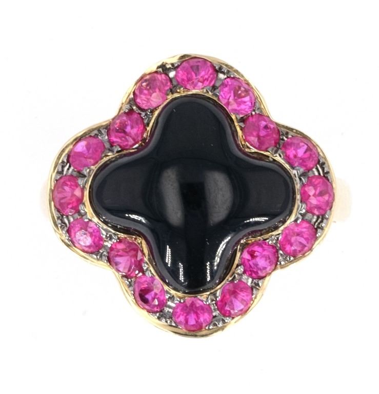 The lot features a 10K gold ring set with onyx and rubies. The ring has a unique four-leaf clover or iron cross polished cabochon of black onyx with a weight of 3.10 carats. The bezel set onyx is surrounded by a matched halo bezel being set with 16 round brilliant cut Ruby stones with a pinkish red coloring and weight of 1.52 carats. The ring is hallmarked 10K CJ and is in brand new condition. Overall the piece shows a 10 karat yellow gold ring with a gold weight of 2.82 grams and is in a size of 7 US.