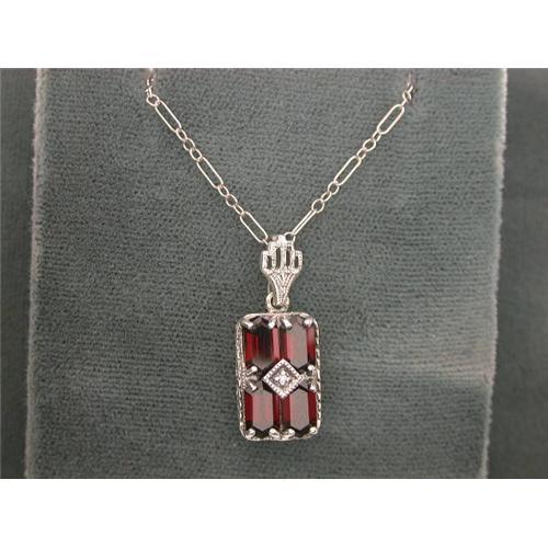 This Antique Style Necklace and Pendant is an Authentic and Accurate copy of a Necklace from the 1930s but THIS one is in MINT condition! It is STERLING SILVER and it features a Pendant with 4 beautiful Genuine GARNETS with a center DIAMOND. There is outstanding Filigree work surrounding the Garnets. The Pendant is suspended from a Sterling Silver neck chain 16" in length.
