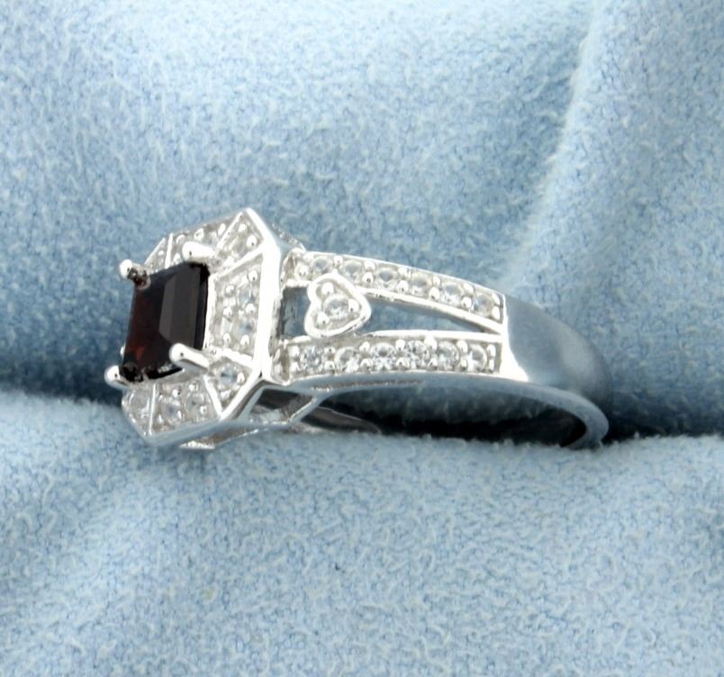 This ring holds a beautiful red color genuine 5mm square cut Garnet gemstone. The mounting is Sterling Silver with Rhodium plating for extra brightness and durability. The design is very detailed with White Sapphire gems set into the silver. Size 7. 4.3g