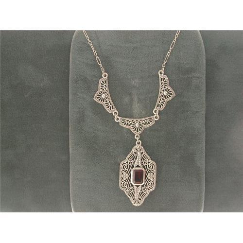 <table width="100%" border="0" cellspacing="0" cellpadding="4"><tr><td><em> Superb Filigree Work and GENUINE GARNET of course!</em></td></tr><tr> <td width="100%"> This Antique Style Pendant Necklace is an Authentic and Accurate copy of a Necklace from the 1930s and THIS one is in MINT condition! It is STERLING SILVER and it features a GARNET Pendant surrounded by Outstanding filigree work. The STERLING Necklace measures 22" in length including the Garnet pendant. </td></tr><tr> <td> </td></tr><tr> <td>Reference #: 60572a</td></tr><tr><td>Condition:Mint</td></tr><tr><td>Year:2006</td></tr><tr><td>Title:Antique Style Sterling Necklace GARNET Filigree</td></tr><tr><td>Location:Virginia</td></tr></table>