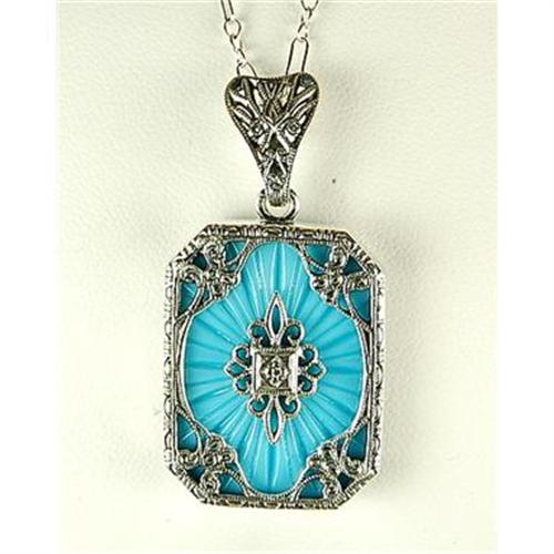 This Antique Style Pendant Necklace is an Authentic and Accurate copy of a Necklace from the 1930s and THIS one is in MINT condition! It is STERLING SILVER and it features a TURQUOISE Pendant surrounded by filigree work with a center DIAMOND. The STERLING Chain is 18" in length and the pendant measures 1" x 3/4".