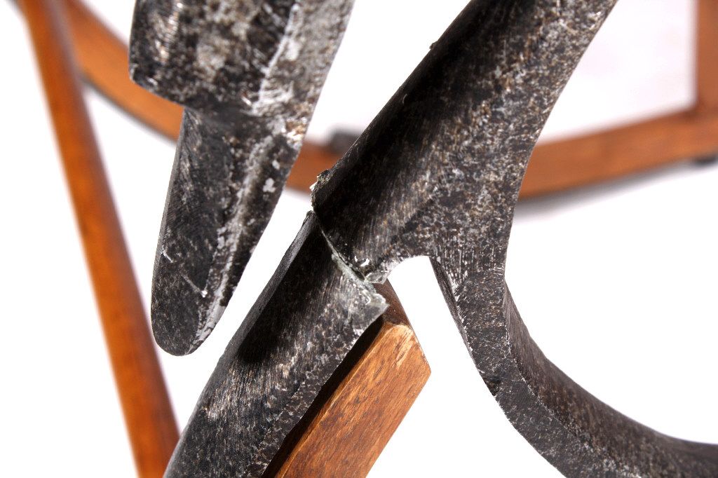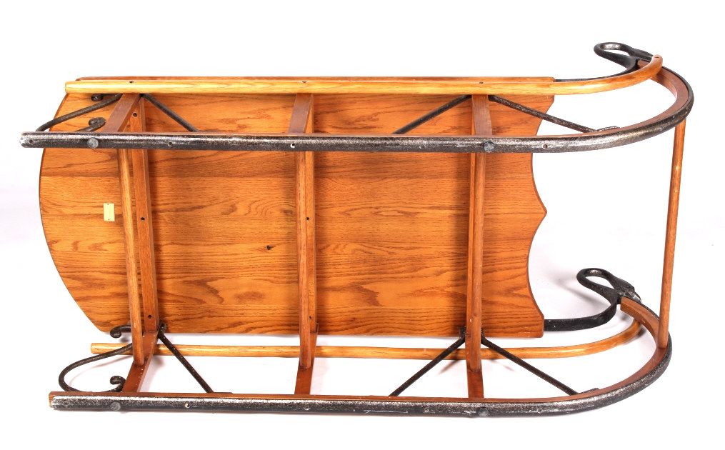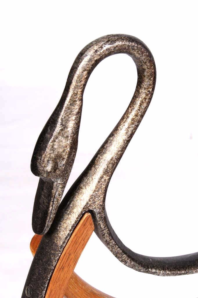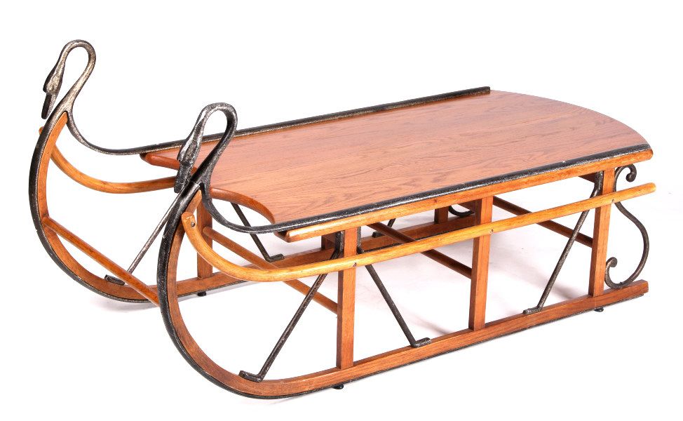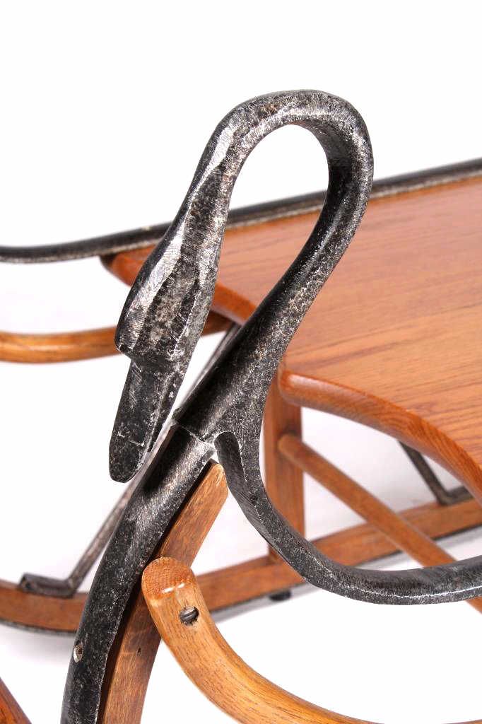 The piece shows a solid oak construction with cast iron swan head bottom and top rails. The piece appears to be in good condition with the front swan having a crack and has a wonderful antique style. This is hand made by Trails Tell City Chair Company. The coffee table measures 25.5"w x 53"l x 26"t