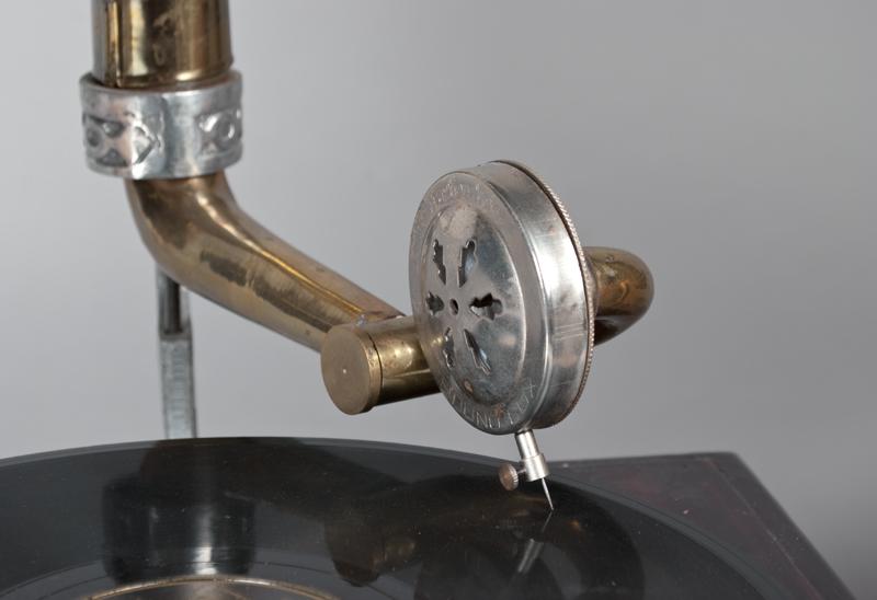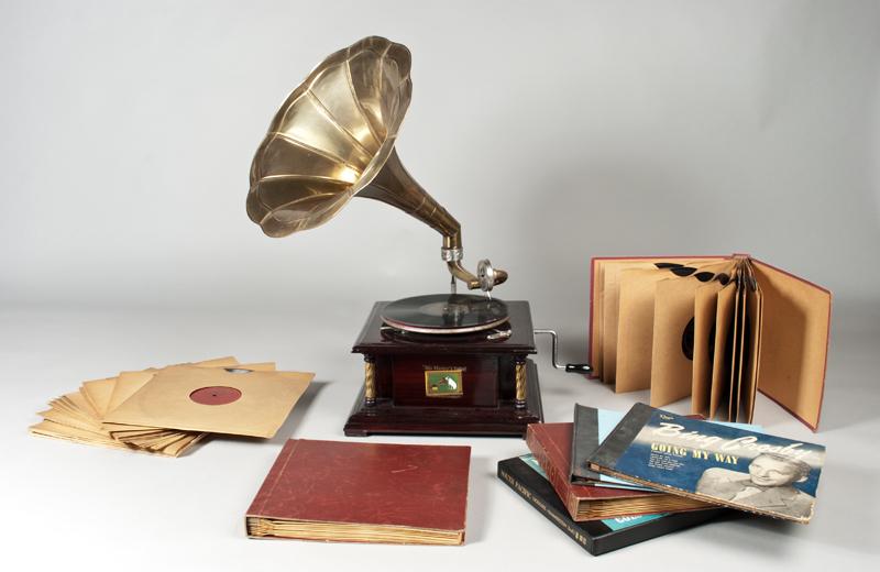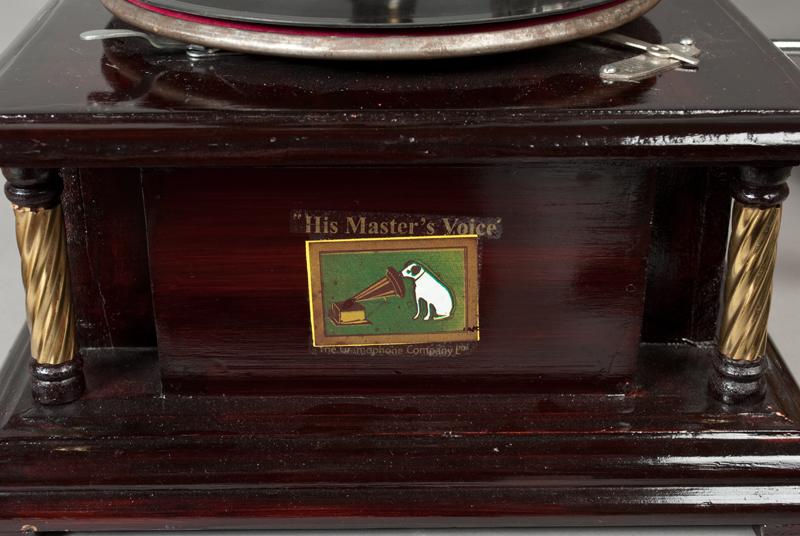 Hand crank record player with extra arm and petal brass horn. Applied decals to front read "His Master's Voice, an image of a dog with a Victrola and The Gramophone Co., Ltd." Together with 20+ records for your listening enjoyment. In working condition.