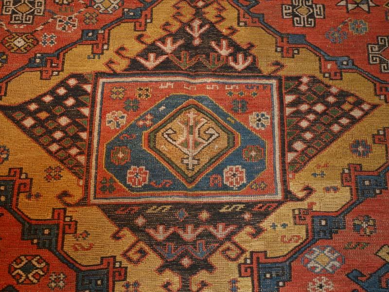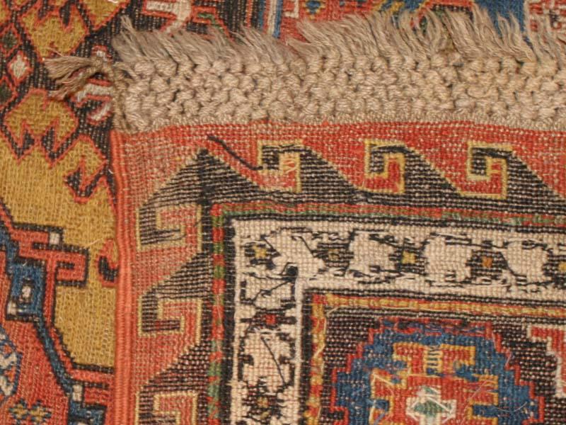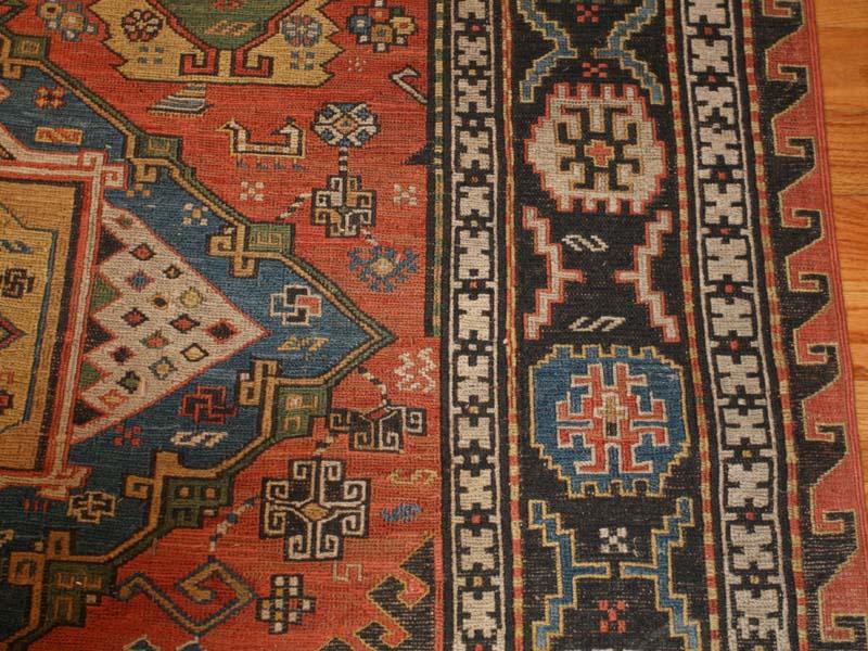 5.08 x 12.08 Late nineteenth century Antique Sumak from the Caucasus - This elegant and exciting antique Caucasian Sumak has a medallion design adapted from classical Turkish rugs of the so-called 'Holbein' type. The combination of color and rich ornamental detail is done to stunning effect, and it is nicely complemented by the smaller medallions of the border set against a dark contrasting ground.