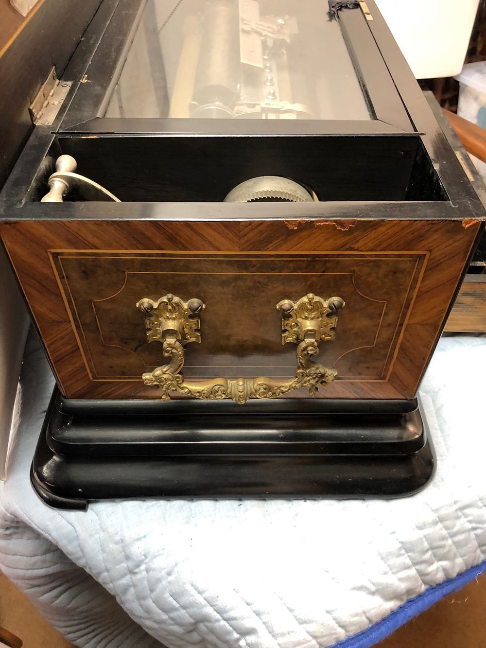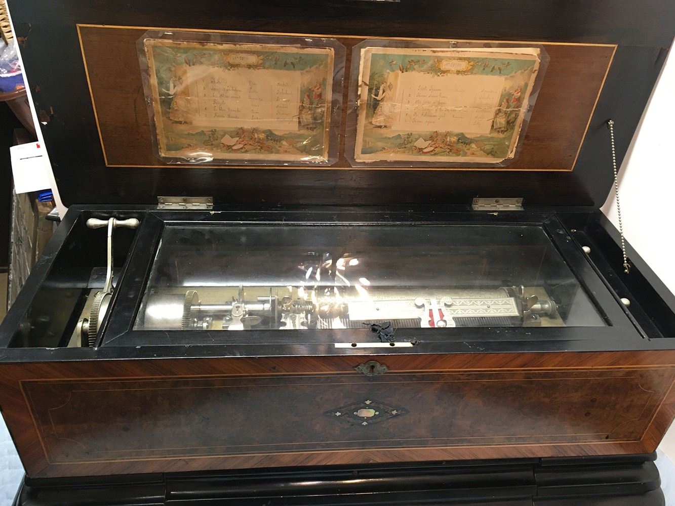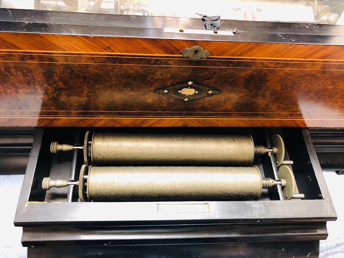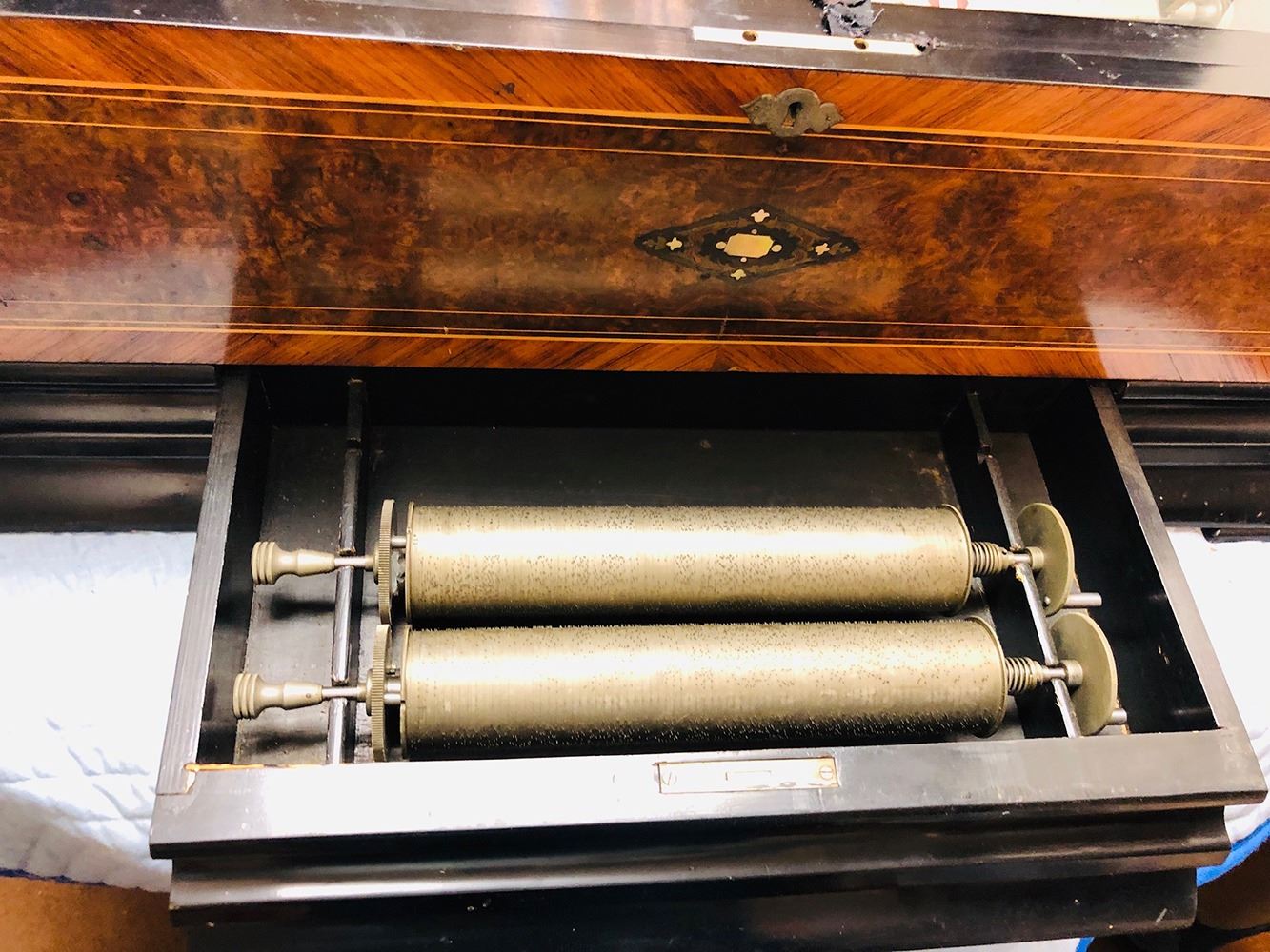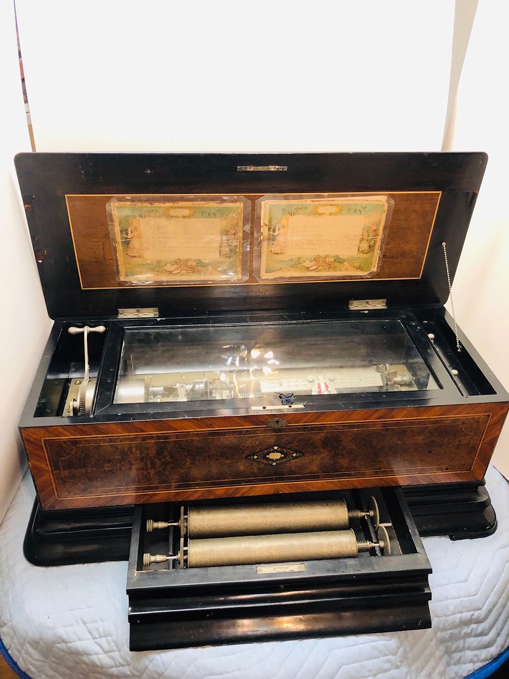 Antique Swiss music box with 3 interchangeable cylinders. Beautiful burl and inlaid case, all in working condition. Music box has bottom front drawer that holds 2 additional cylinders. Ornate, with heavy bronze handles on each sides. Original music cards still inside top cover. Music box is beautiful all over!