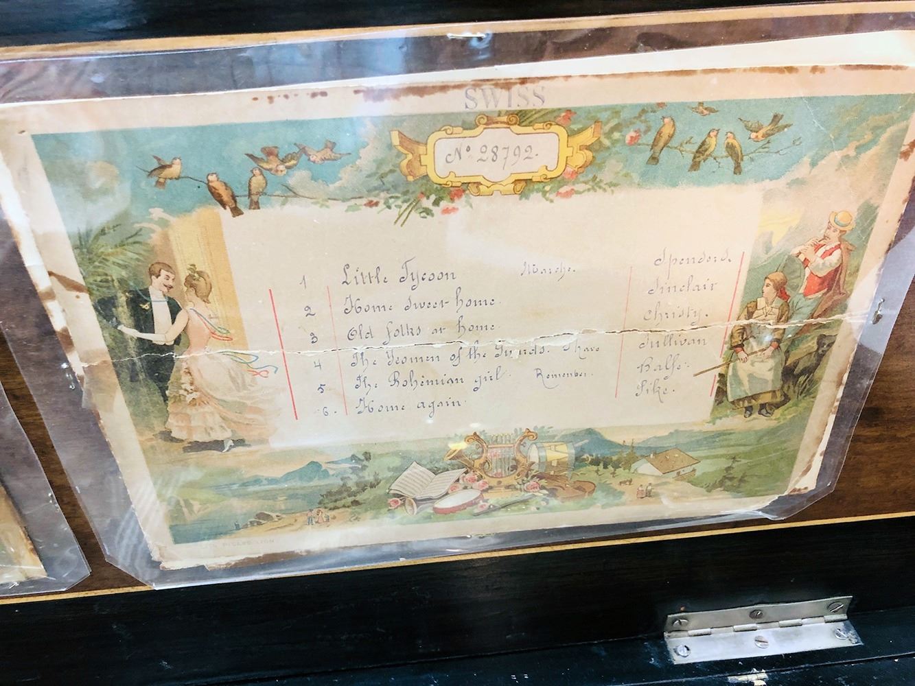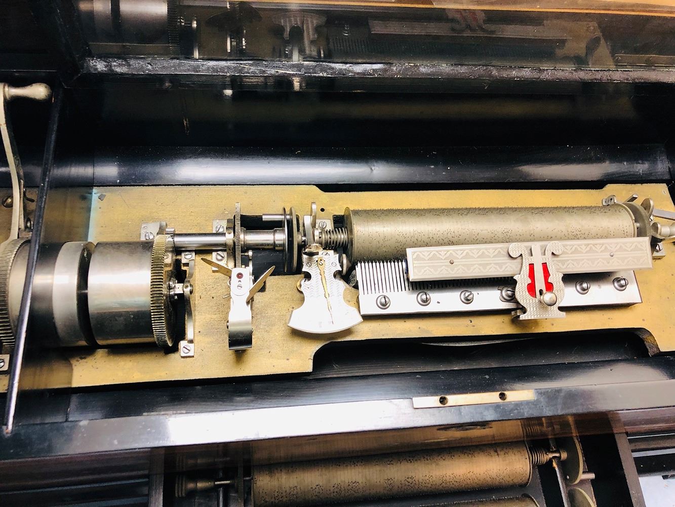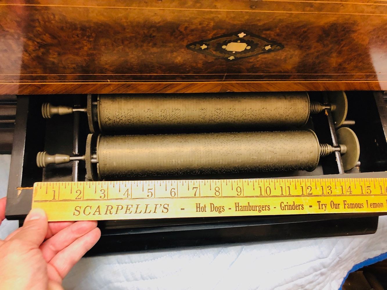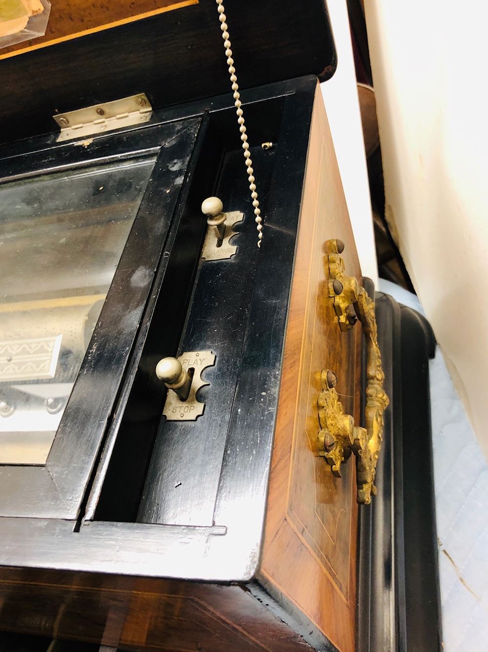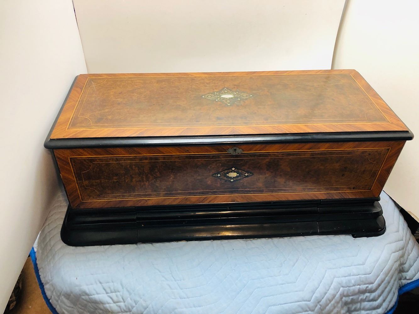 Antique Swiss music box with 3 interchangeable cylinders. Beautiful burl and inlaid case, all in working condition. Music box has bottom front drawer that holds 2 additional cylinders. Ornate, with heavy bronze handles on each sides. Original music cards still inside top cover. Music box is beautiful all over!
