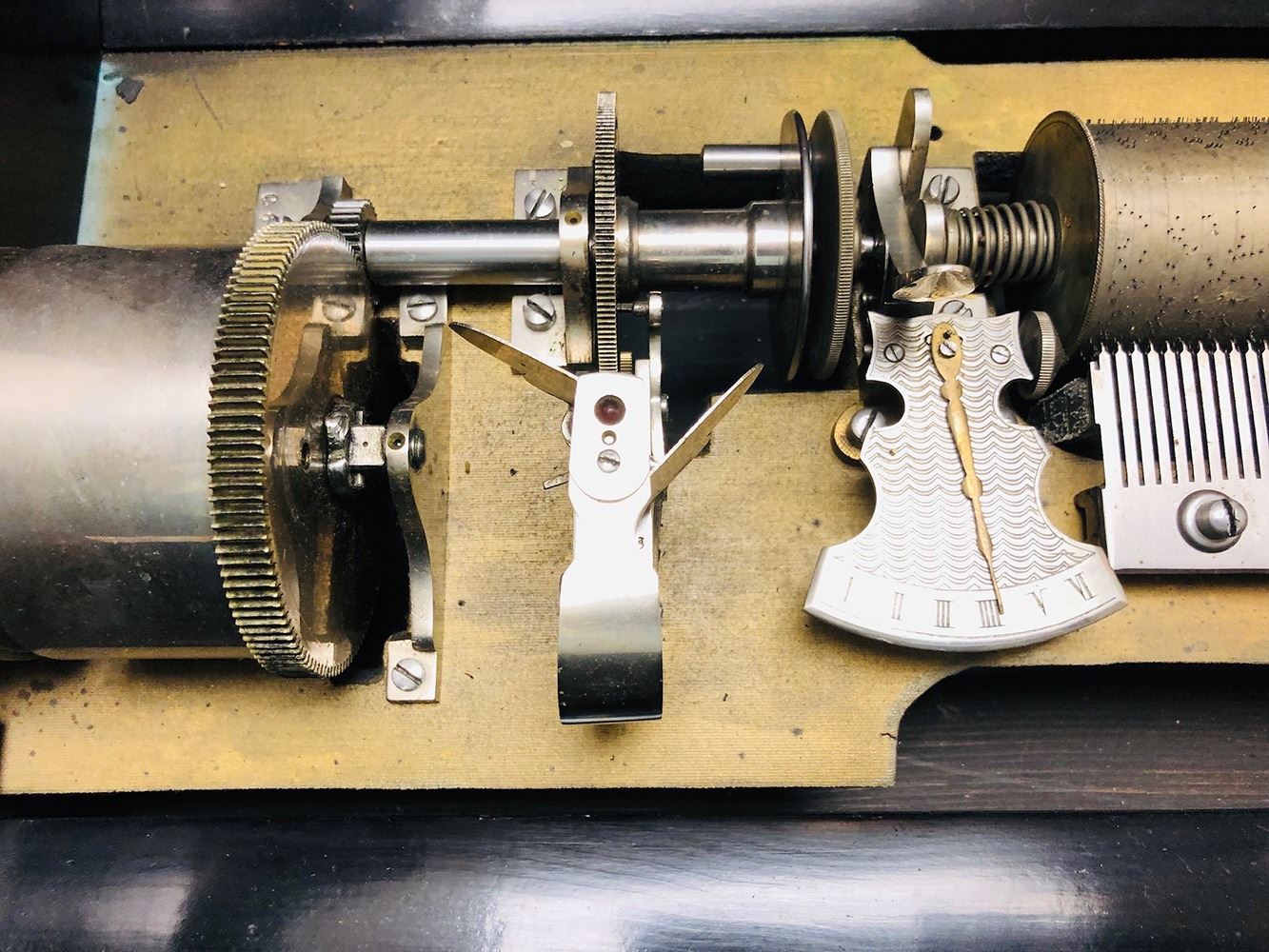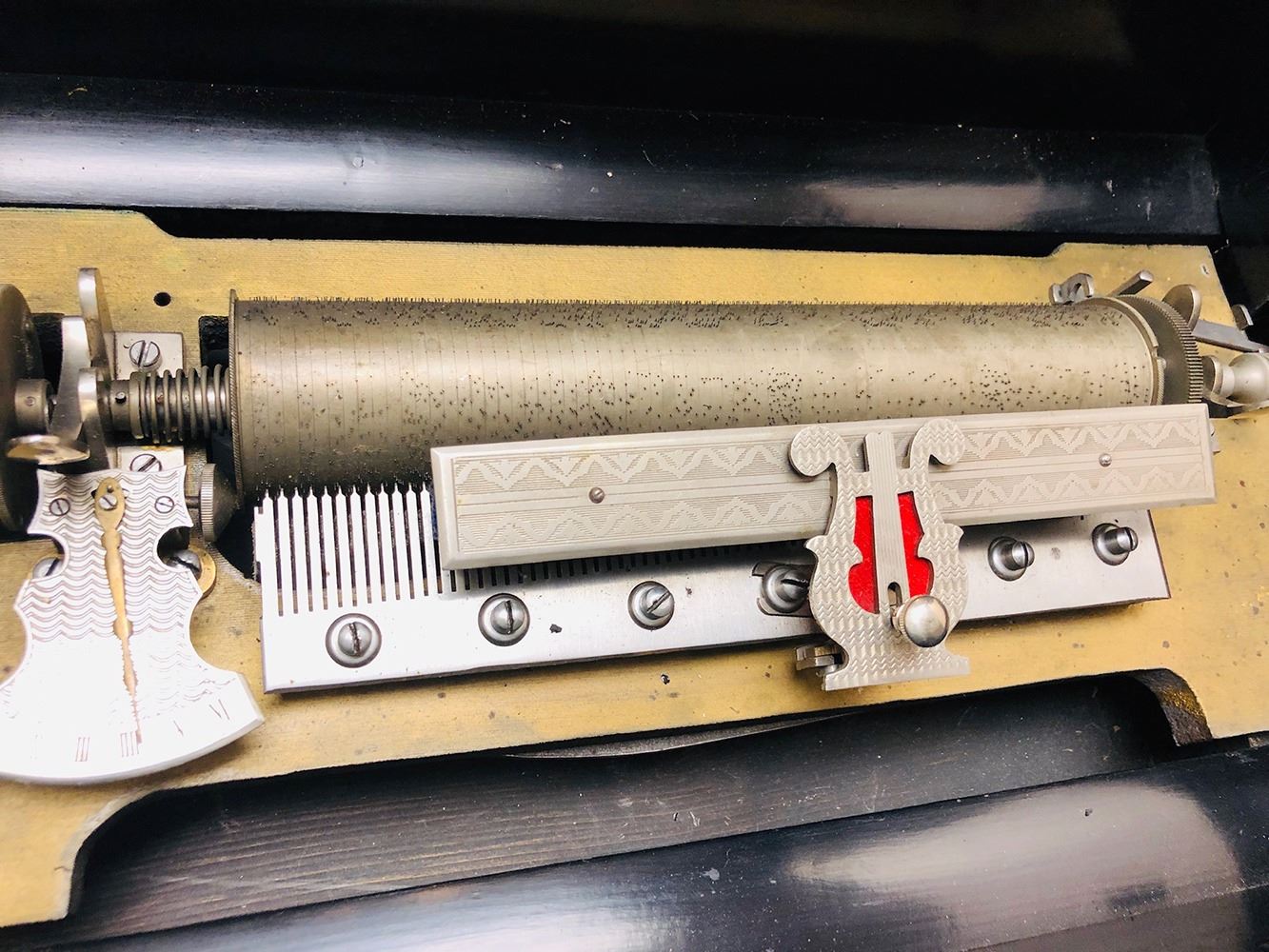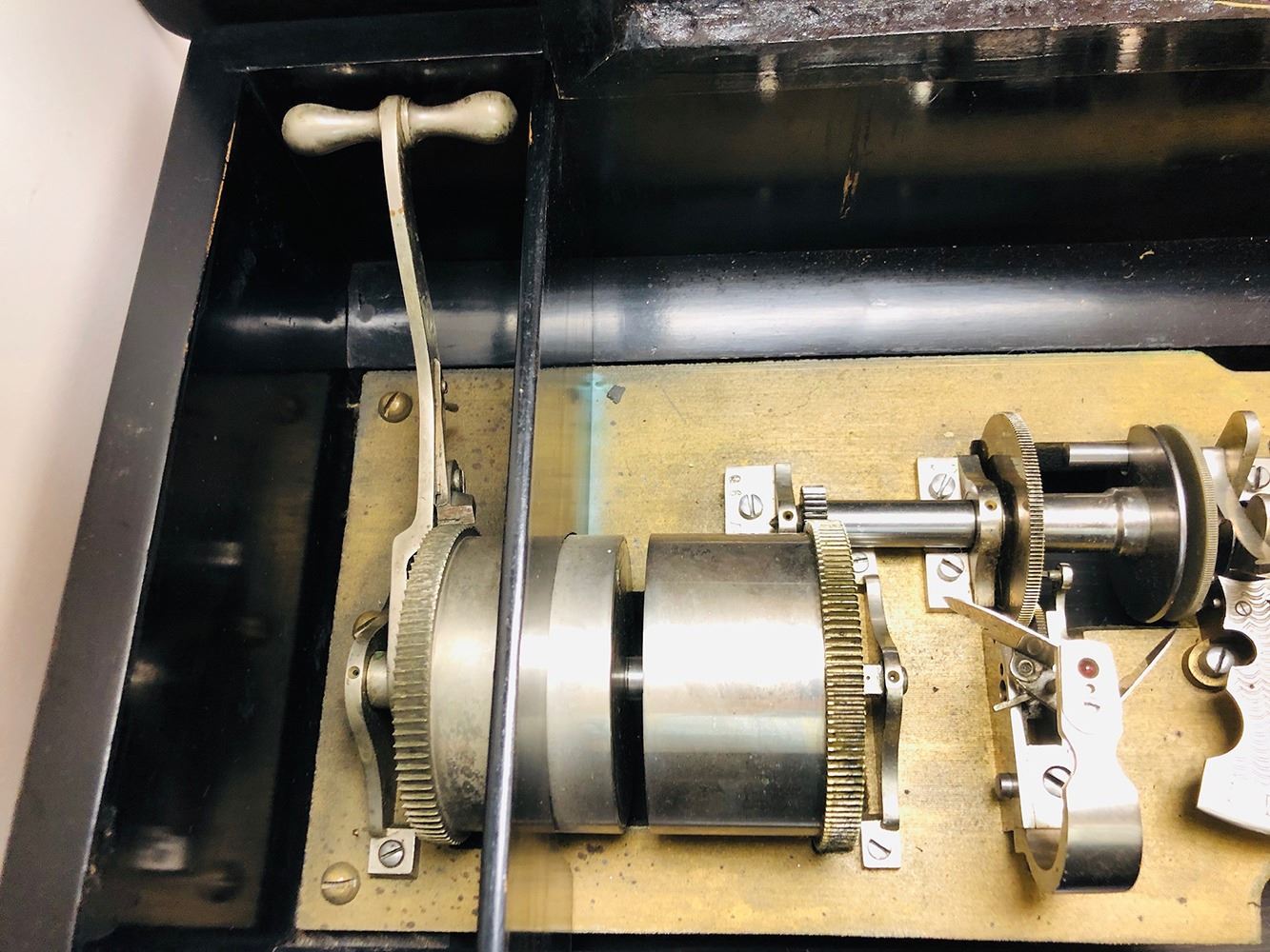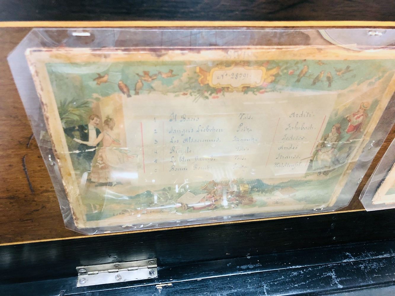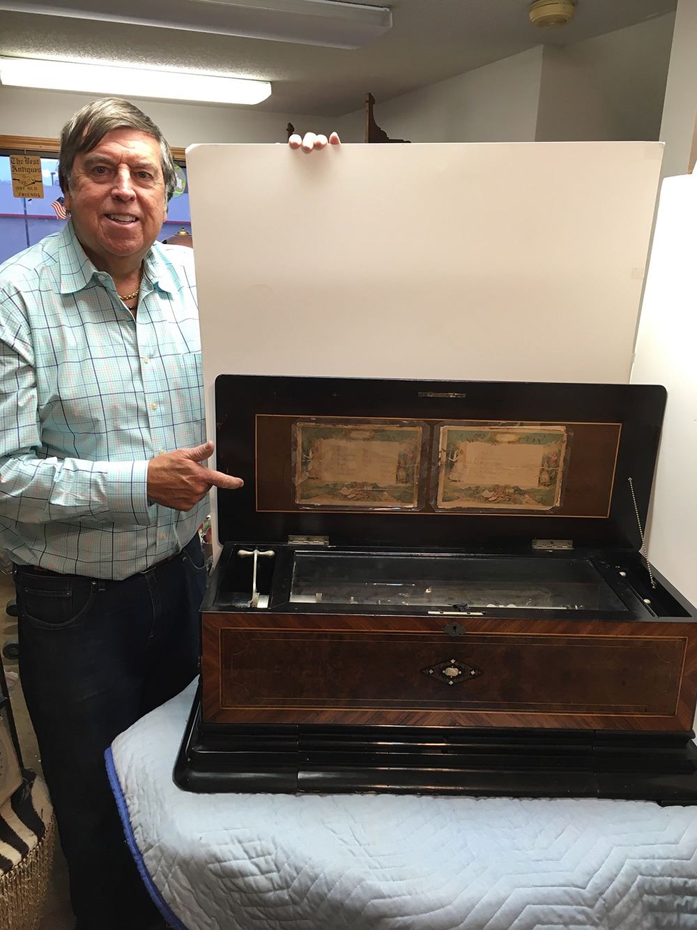 Antique Swiss music box with 3 interchangeable cylinders. Beautiful burl and inlaid case, all in working condition. Music box has bottom front drawer that holds 2 additional cylinders. Ornate, with heavy bronze handles on each sides. Original music cards still inside top cover. Music box is beautiful all over!
