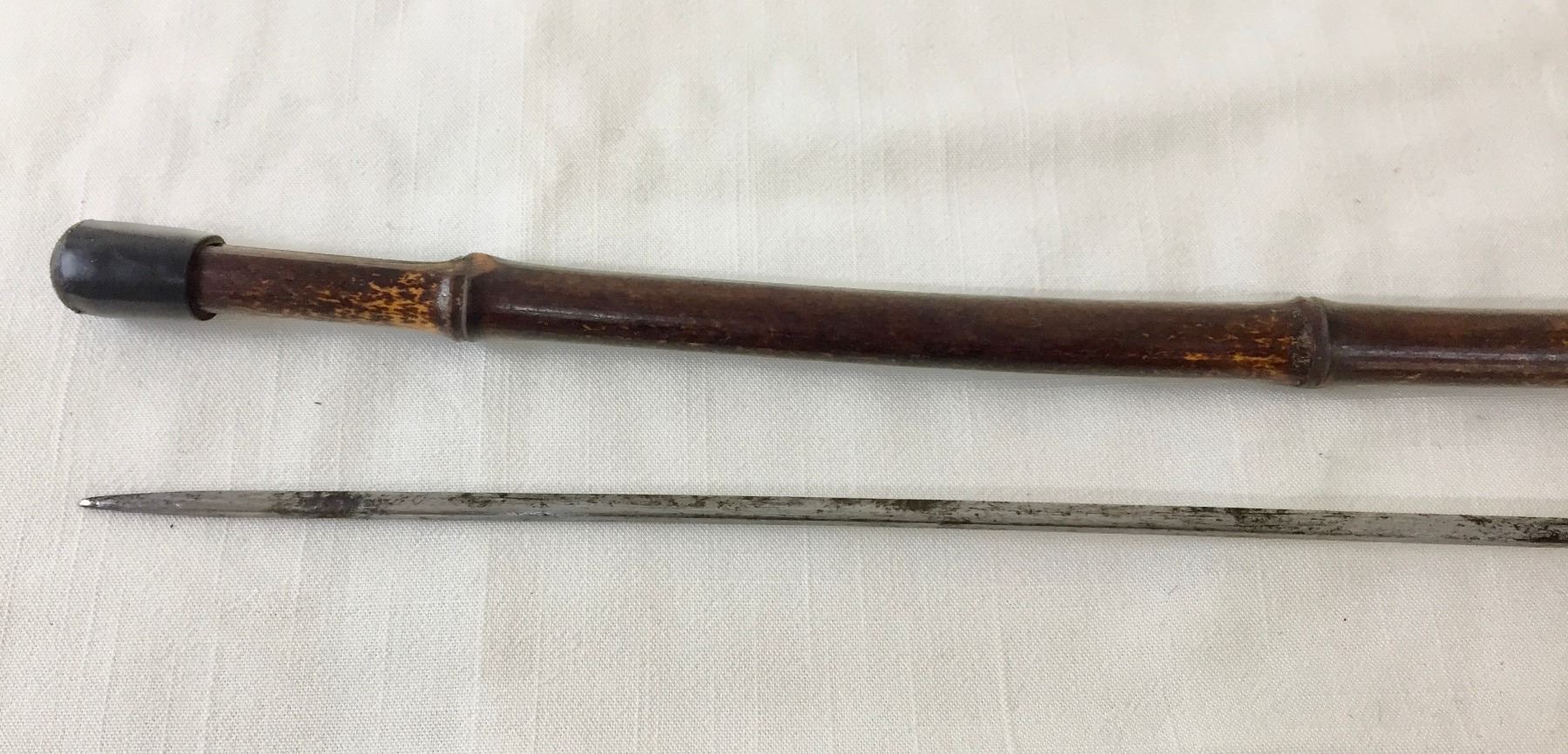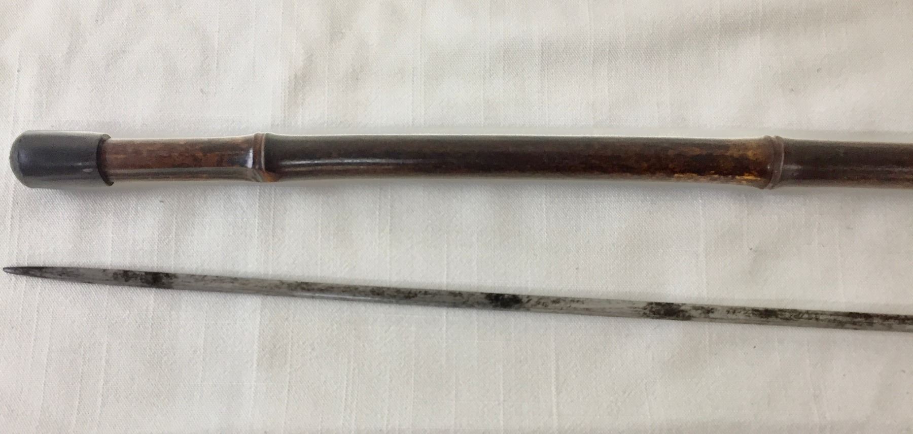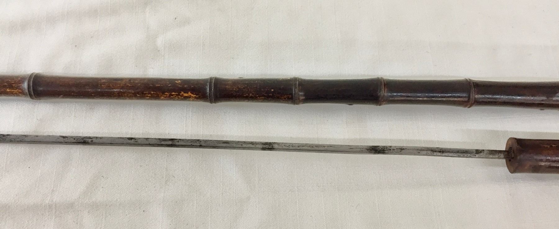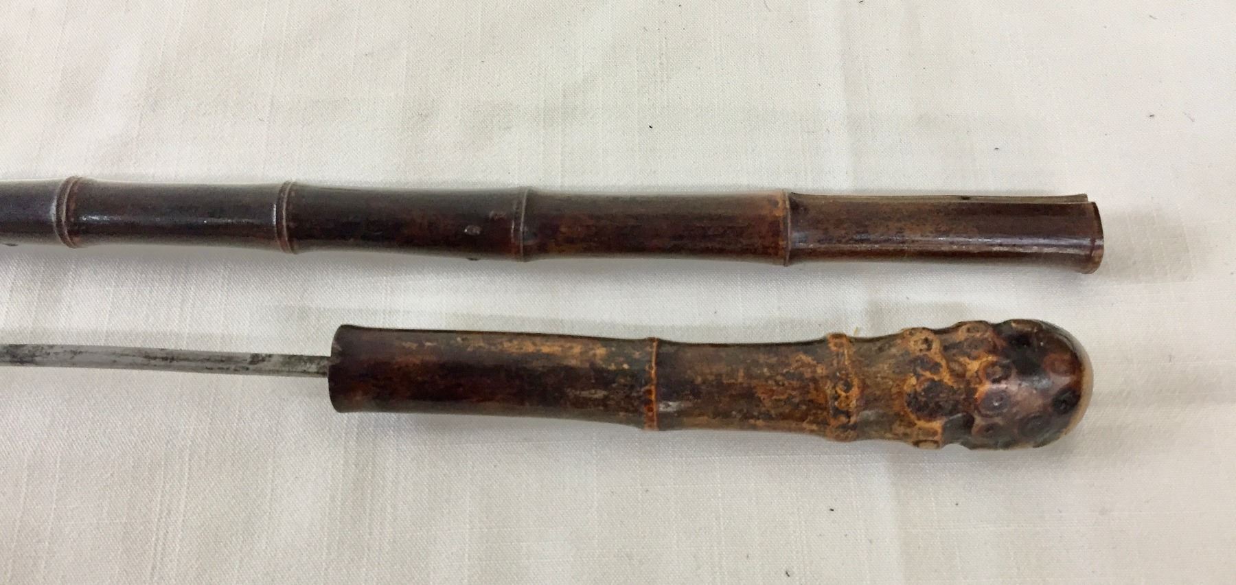 Description: Featured in this lot is an antique sword cane featuring a bamboo scabbard and nice details on the handle.