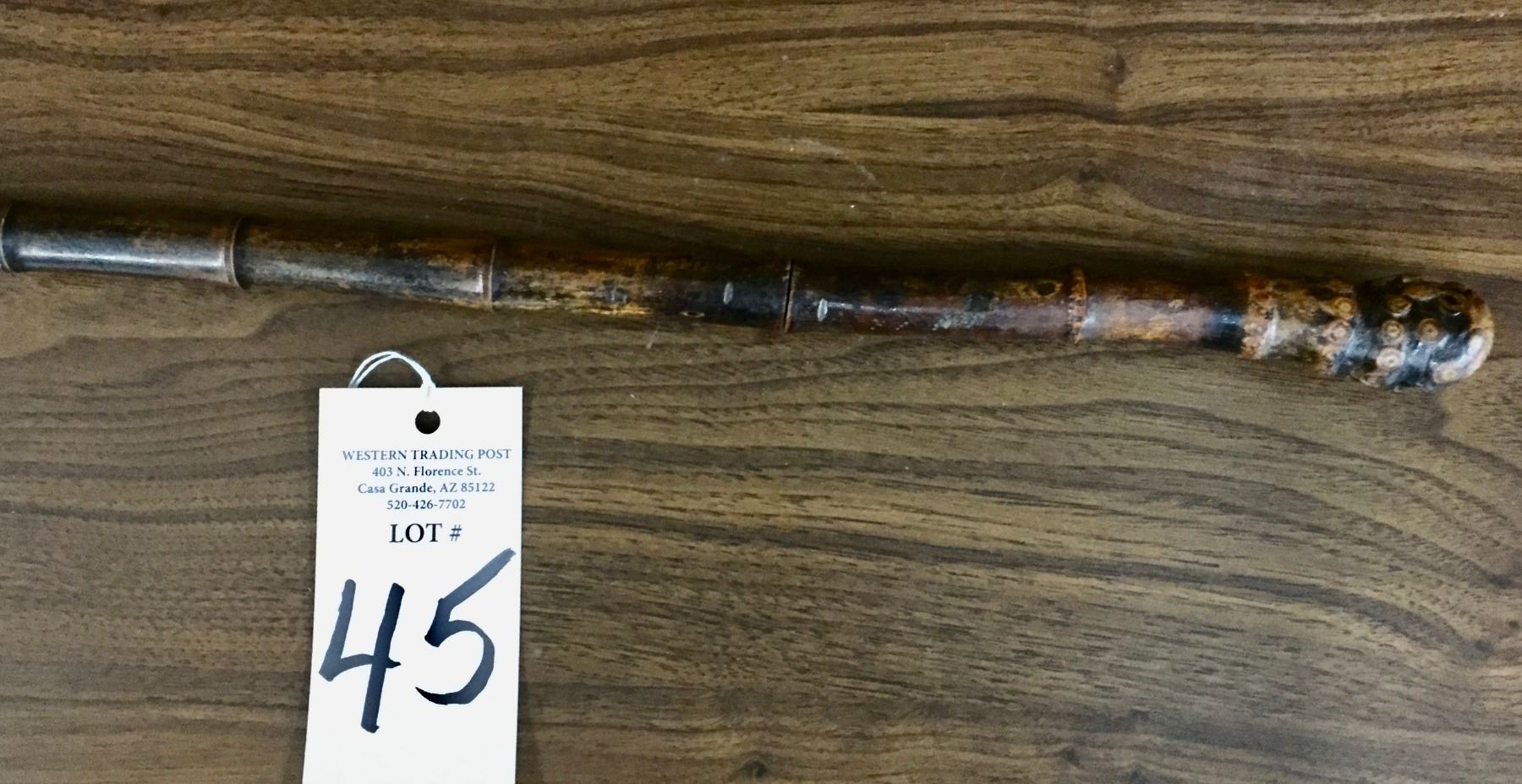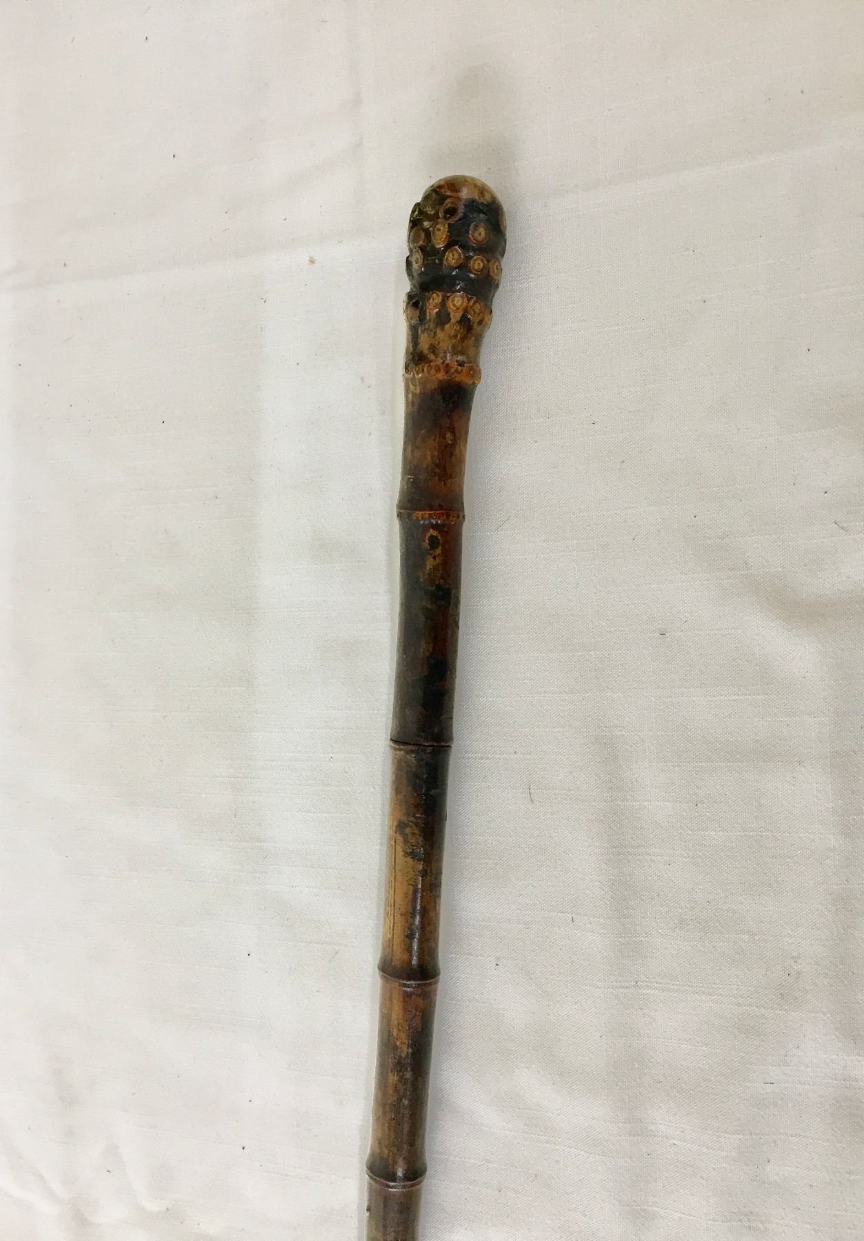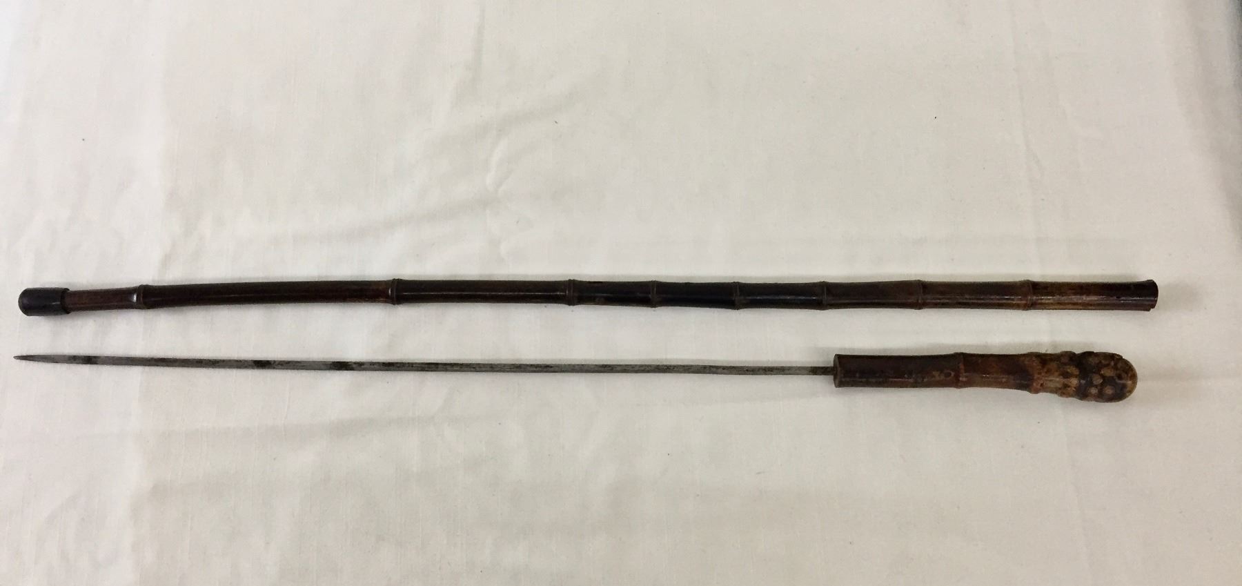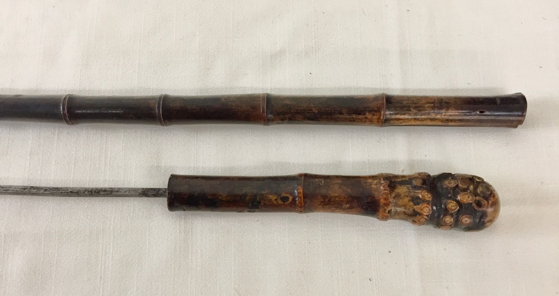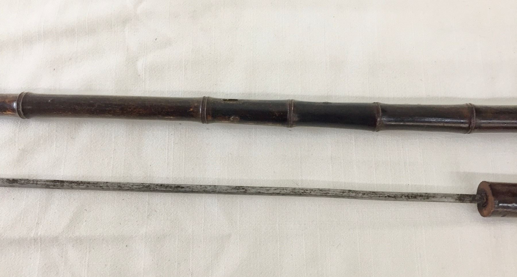 Description: Featured in this lot is an antique sword cane featuring a bamboo scabbard and nice details on the handle.