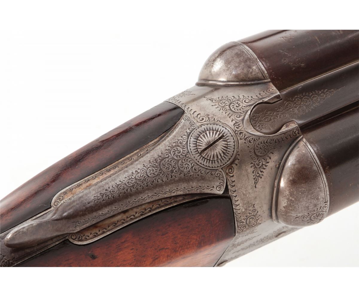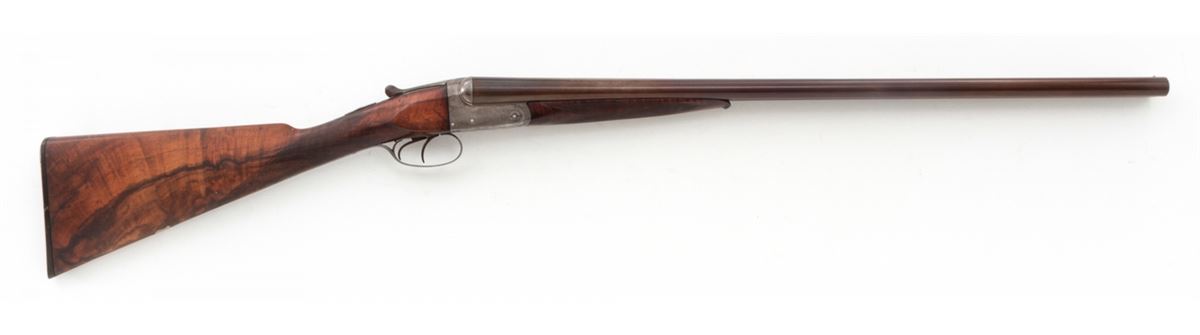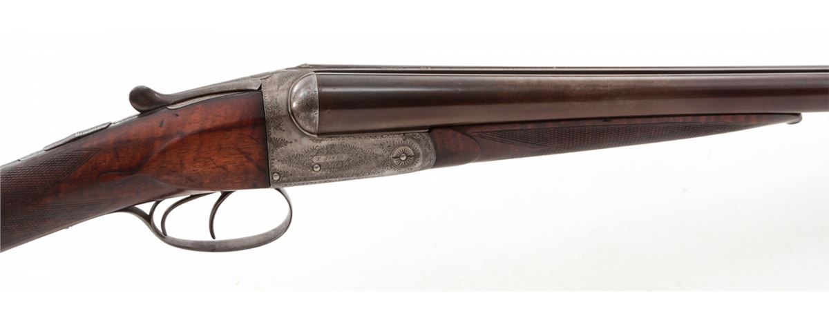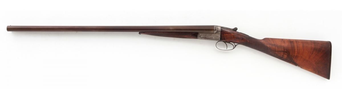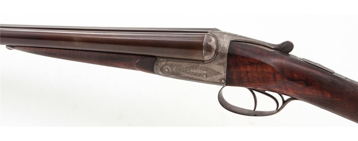 Antique English Side-by-Side Shotgun, by R. Jones, Liverpool, #7002, 12 ga., 28'' barrels choked Full/Mod., banknote engraved case hardened bloxlock frame, with straight checkered walnut stock and splinter forend. Top of barrel marked ''Robert Jones & Co., Dale Street, Liverpool''. Condition is very good as partially refinished. Barrels show approx. 85%-90% of a later brown, traces of case colors remain to sides of frame and in protected areas. Stock with light to moderate flattening to checks, with some worming to replacement buttplate. Good action and bores. Est.: $500-$750. (Antique)