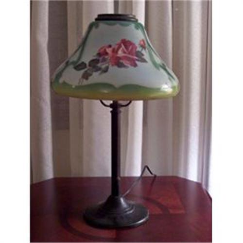 Pleased to offer this beautiful antique table lamp recently acquired at an estate sale. The base is unsigned with the exception of two stamps of the number 1456. I was told by a reputable dealer that the shade is an unsigned Handel. He had seen Handel shades with the exact same outlined scroll pattern that this one has, and was quite sure this is the real deal. The hand painted shade has hues of green with a raised gold outline of the darker green scroll design. Red Roses and buds have a wonderful real feeling. I believe the base is a zinc alloy. The single socket and on/off pull chain look to be original. The wiring has been updated and is in good working condition. The shade is in extremely good condition for it's age. There are some very tiny chips and roughness on the bottom inside edge, that cannot be seen without turning the shade upside down and really looking. The shade measures 11 7/8" at it's widest, the base 6 1/2" wide. The entire lamp is 19" tall. Very pretty lamp!
