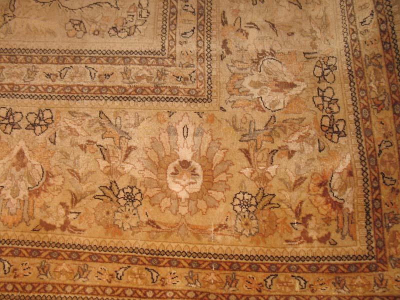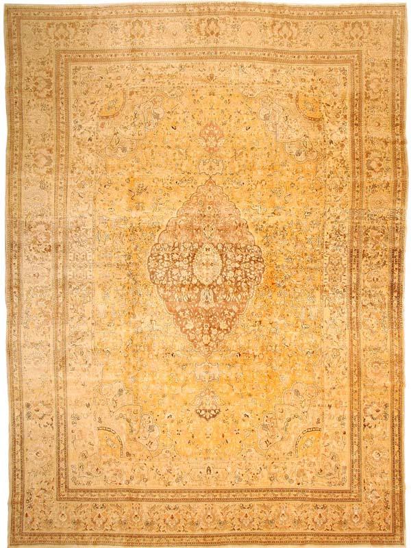 14.04 x 19.04 Early 20th century Antique Persian Tabriz Carpet - A lovely scalloped medallion and cornerpieces comprises the main elements of the field on this exceptionally decorative Tabriz, although only the former makes an immediate impression. The cornerpieces are rendered in the same ivory tones a small floral details as the ground, and so they recede initially from our view. The border too follows the tones and graphics of the field, imparting a unified texture to the overall design.