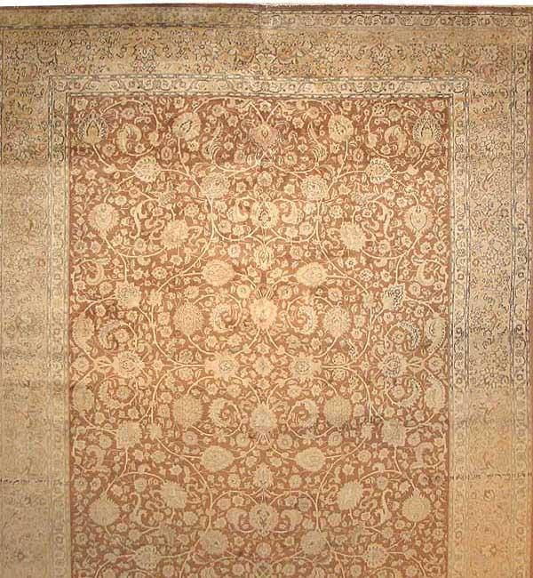 9.10 x 12.11 Early twentieth century Antique Tabriz Rug from Persia - Grand scale and exquisite detail come together beautifully in this elegant antique Tabriz. Delicate vinescrolls of soft tan spiral in graceful rhythms across a light cocoa ground, while sprouting a rich array of small palmettes and tiny graceful flowers that gently animate the entire surface. The fine tracery of these flowers continues into the border, where the predominantly pale tan tone provides a nice contrasting frame to the cocoa field.