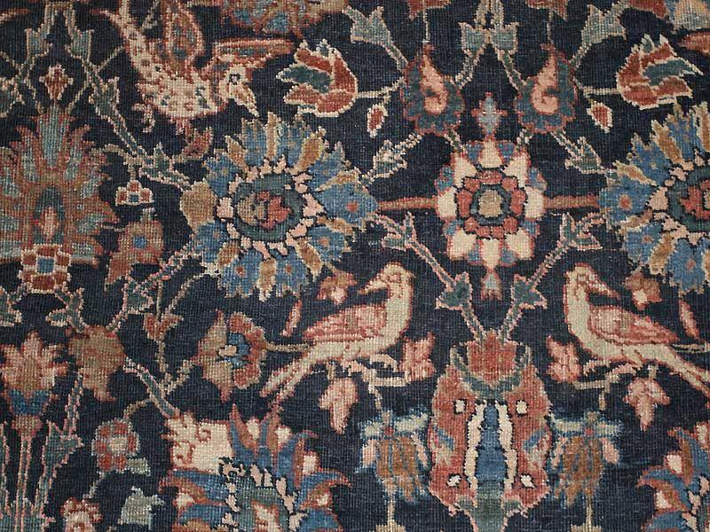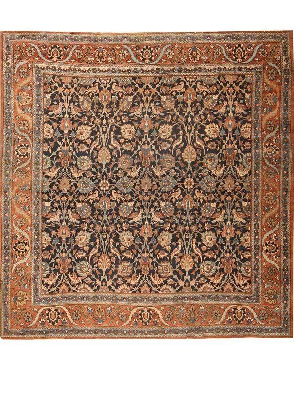 10.00 x 10.04 Late nineteenth century Antique Tabriz, Northwest Persia - A staggered array of flowering v-shaped vines and palmettes in shades of gold, tan, and soft green, repeats rhythmically across the deep navy ground of this sumptuous antique Tabriz. Amidst this floral exuberance pairs of birds flank the base of the v-forms, adding an animated pictorial quality to the ornamental framework of the entire design. A vinescroll border with palmettes like those of the field is set against a cinnamon ground, surrounded to either side by sage green minor borders, which collectively frame the field design with a lovely color contrast.
