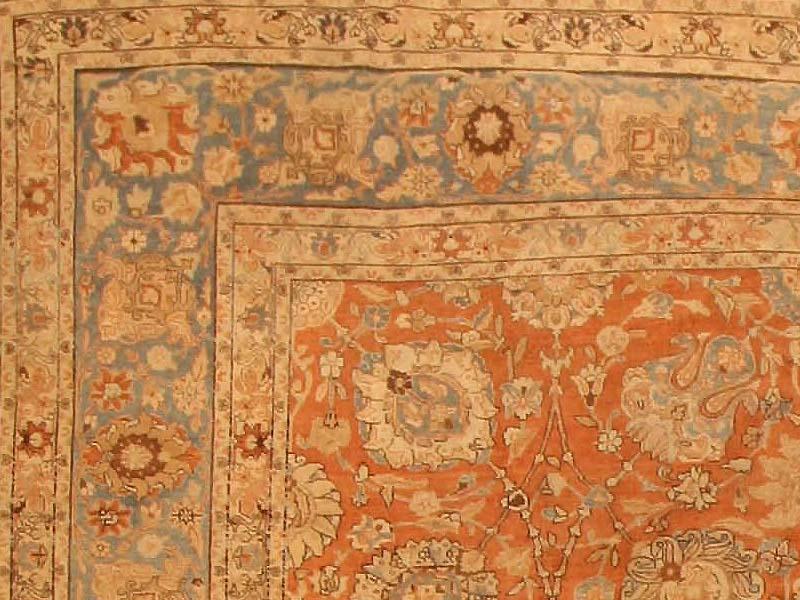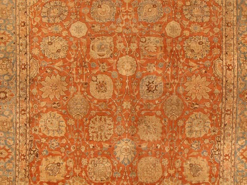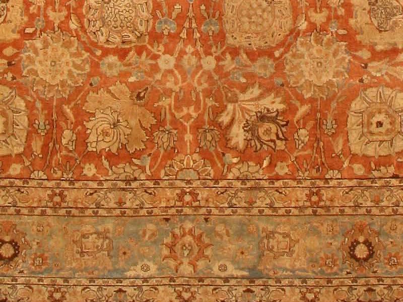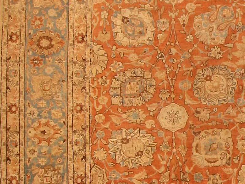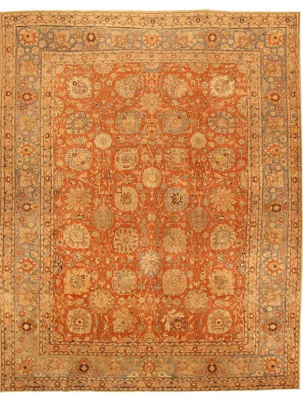 12.00 x 15.00 Late nineteenth century Antique Tabriz Rug, Persia - This sumptuous antique Tabriz recalls the great Persian court carpets of the seventeenth century with its lavish all over design of vinescrolls and palmettes, surrounded by a lush vinescroll border as well. But the delicate range of colors in cinnamons and pale, watery blues is very different from the vibrant palette of the classical forerunners. Instead, its reserved sensibility has considerable decorative flexibility, adapting the grace and elegance of classic Persian carpets to more modern possibilities. The lustrous wool of the pile sets off the beauty of the design to great effect.