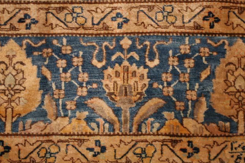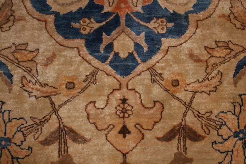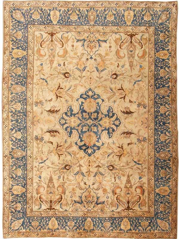 9.02 x 12.11 Late nineteenth century Antique Tabriz Rug, Persia - Antique Tabriz carpets like this are famed for their fidelity to earlier, classical Persian designs. Here scalloped quatrefoil medallion in soft blue floats amidst an array of suavely drawn arabesque vinescrolls and palmettes on a cool tan ground. In the main border stylized trees and shrubs repeat in alternation against a soft blue ground, making a an effective framing contrast to the field, while ivory minor borders provide a smooth transition. Few nineteenth-century Persian rugs recall the great masterpieces of the Safavid era so well, especially with a palette so gentle and decorative.