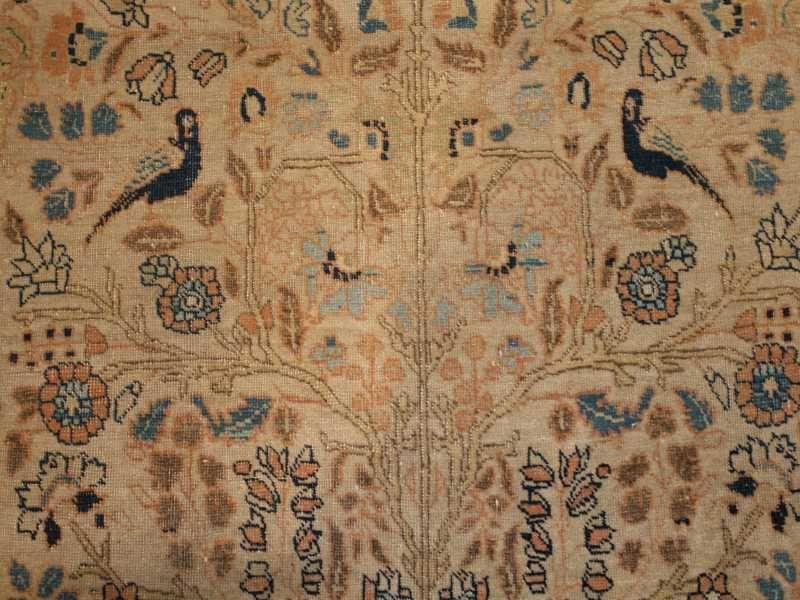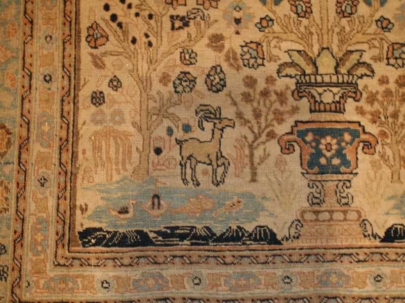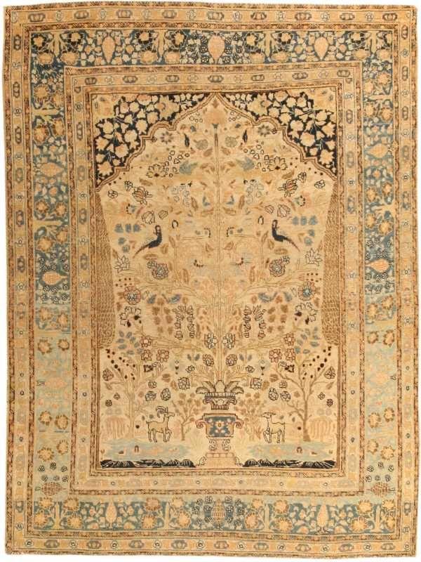 4.01 x 5.05 Late nineteenth century Antique Tabriz, Persia - A stylized image of paradise appears amidst a scalloped niche or ‘mihrab’ on this exquisite antique Tabriz prayer rug. At the base of the niche a vase flanked by gazelles spews forth a tree of life whose radiating branches burgeon forth with flowers, leaves, and birds, all against a creamy tan ground. The spandrels of the niche contain a rich leafy fill against a dark blue for contrast with the field. The detail and coloration of the spandrels continue into the main border, enclosed by cream-ground minor borders for framing emphasis. The weave and drawing are fine and precise in the tradition of the great Safavid Persian carpets of the classical period.