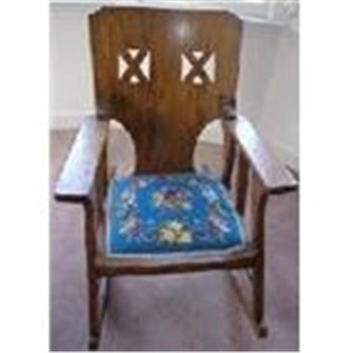 ***FREE DELIVERY WITHIN THE ATLANTA, GEORGIA AND SURROUNDING AREA*** This is a unique hand crafted rocker with a bright bold tapestry seating. I love the geometrical open carvings that go all the way through the back. In addition, the seat and arms are a generous size. I tried it myself and it is quite comfortable and sturdy. Shipping, pick-up or local delivery available