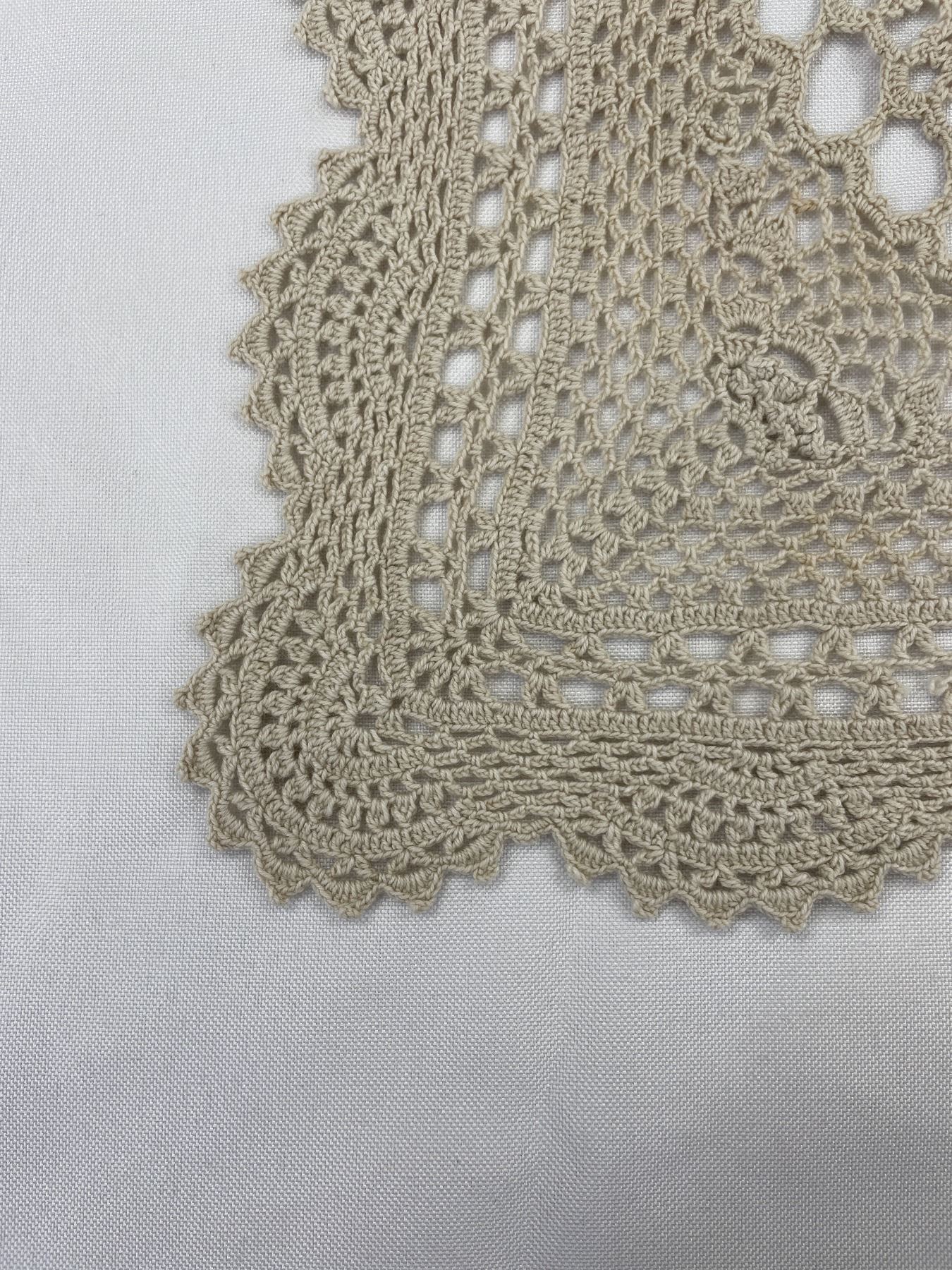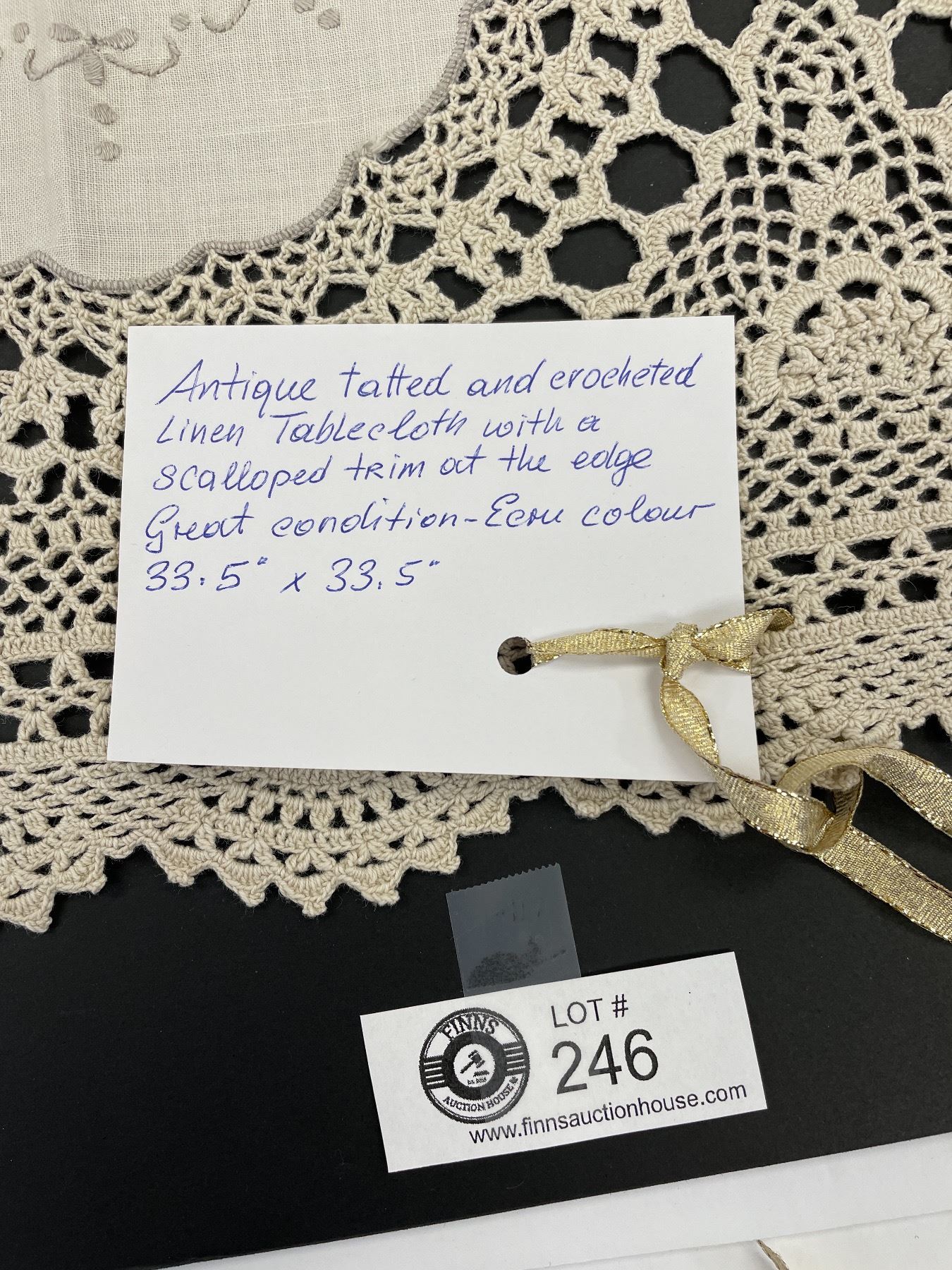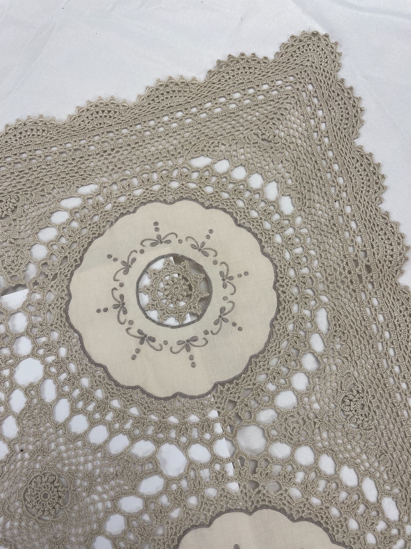 Antique Tatted and Crocheted Linen Tablecloth with Scallopped Trim Ecmu Colored 33.5 x 33.5