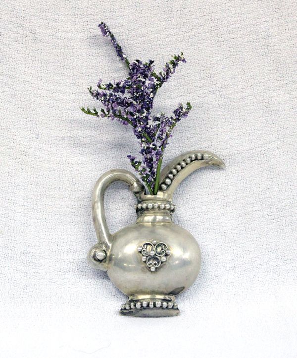 Antique Taxco Sterling Silver POSY HOLDER ''Tussie Mussie'', three dimensional Sterling Silver Ewer for holding live flowers and worn as a pin. Marked on the back sterling Taxco MCE 925. Measures approx. 1.25''H x 1.75''W x .50''D. Dried Flower included.