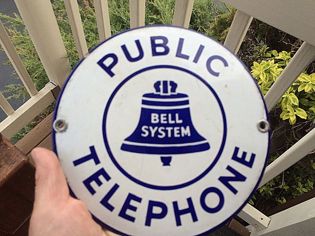 Antique Telephone Sign, Enameled on both sides, Public Telephone, Bell System. Great Americana item!
