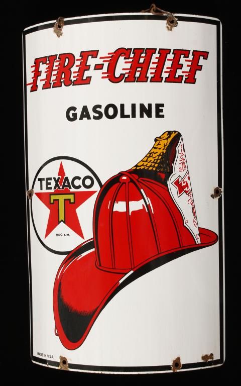 Measures 10-9/16" wide by 18" tall. The front  reads "Fire-Chief Gasoline Texaco". It also  shows a fireman's helmet. This sign is curved  to fit on the actual gas pump. Has smooth  porcelain on both sides.