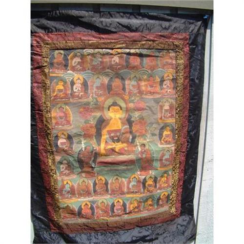 19th. century Tibetan tangka with painting on canvas representing a central figure of Buddha seated in dhianasana on a single lotus throne with hands in bhumisparsa and dhiana mudra holding patra. There are 7 vertical and 7 horizontal rows of Buddhas in different positions, seated on single lotus throne. 3 rows of brocade silk are framing the tangka. Estimated value: $2.000.