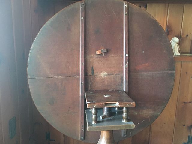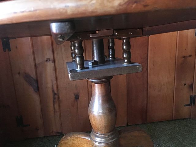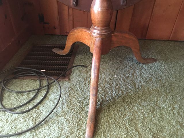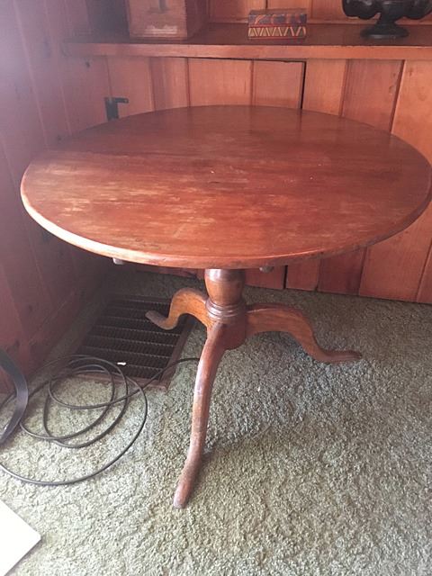 Antique Tilt Top Table, Connecticut made, probably made right in Harwinton, with Birdcage underneath, original ironwork with rosehead nails. Top measures approx. 31" wide.