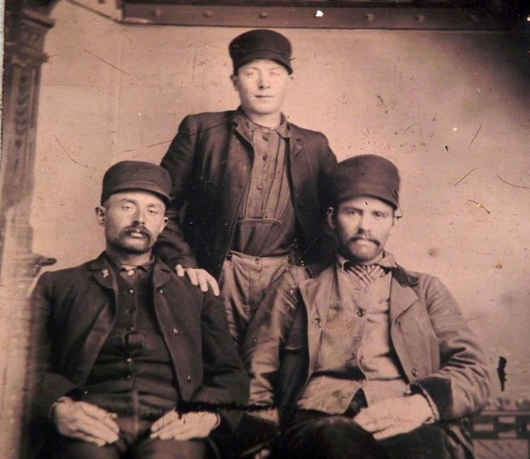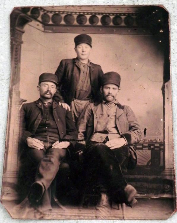 This is an antique tintype photographic studio portrait of three men wearing some kind of hats, looking like official workers of some type. The size is 1/6 plate, approximately 2 1/2" x 3 1/4". It dates from the late 1800's most likely. Its condition is good overall, with surface wear and dent, lower left. This is a great portrait of some particurlar men.