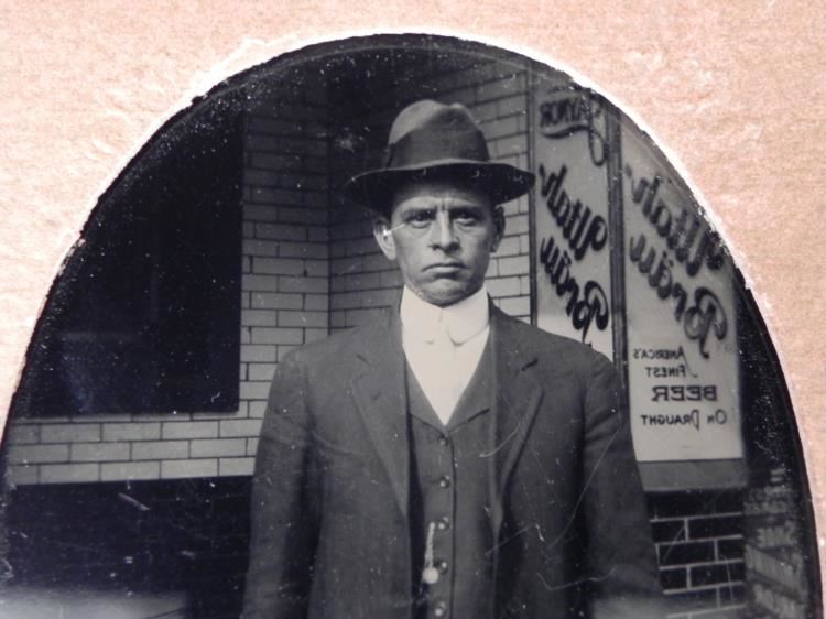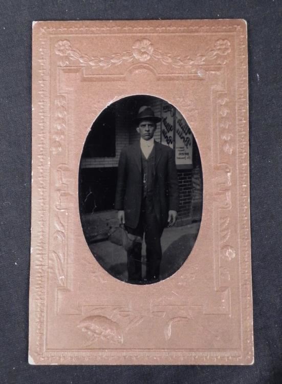 Here is a tintype photographic portrait of a well dressed man standing on the sidewalk holding a satchell. It dates from the very early 20th century. The building behind him shows a German beer sign. The image size is 2 1/2 x 3 1/2". There is very light wear and crazing, and otherwise it is in very good condition, with crisp detail. The brown paper frame is in remarkably good condition, and has a nice embossed flower and laurels design. This is a great street portrait with the bonus of old advertising.