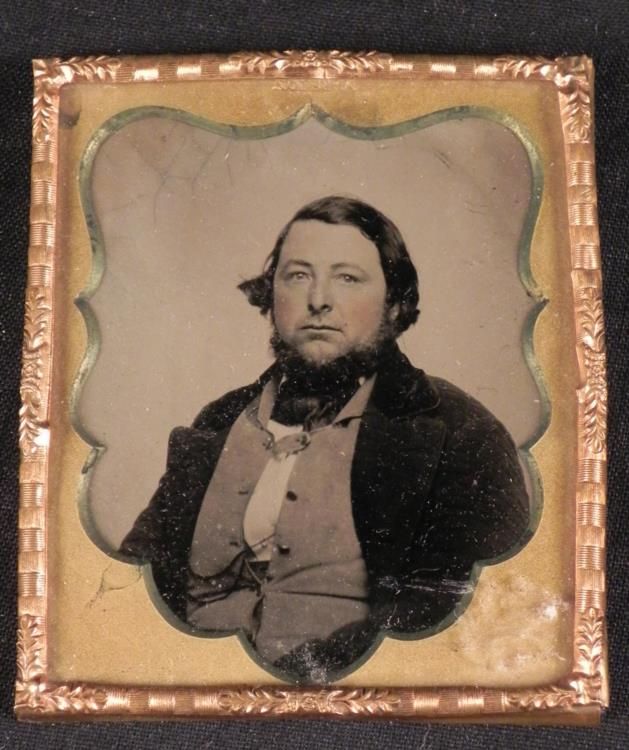 This antique tintype photographic studio portrait is of a rather heavyset man with a beard, and tinted cheeks. It is a 1/6 plate size, approximately 2 1/2" x 3 1/4", and includes the foil embossed border. It dates from the late 1800's most likely. * This is a portrait of a