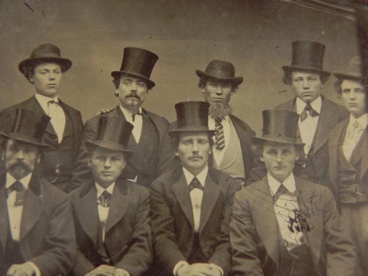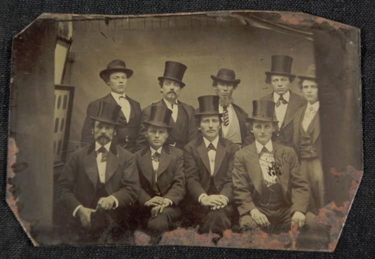 Here is an antique tintype photographic studio portrait of nine men wearing terrific top hats. The size is 1/6th plate. The condition is good, with some surface wear, and wear near the lower edge. The images are crisp. * * The location and date are not known. * * These must have been prominent men in their day, and its unusual to have so many in tophats in such a great photo.