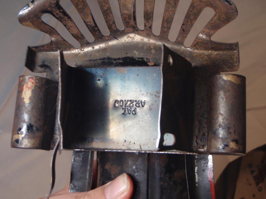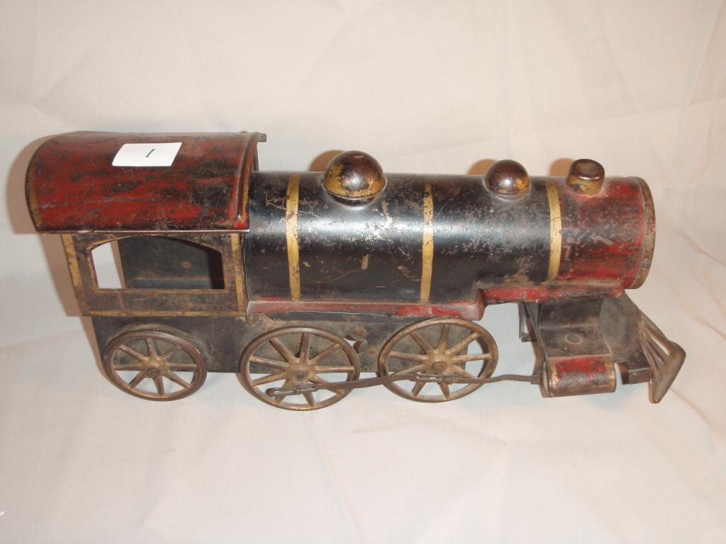 Black & red w/ gold trim. stamped on bottom "PAT AP.27.09" it is 15" long. Missing magnet and rods to connect all wheels.
